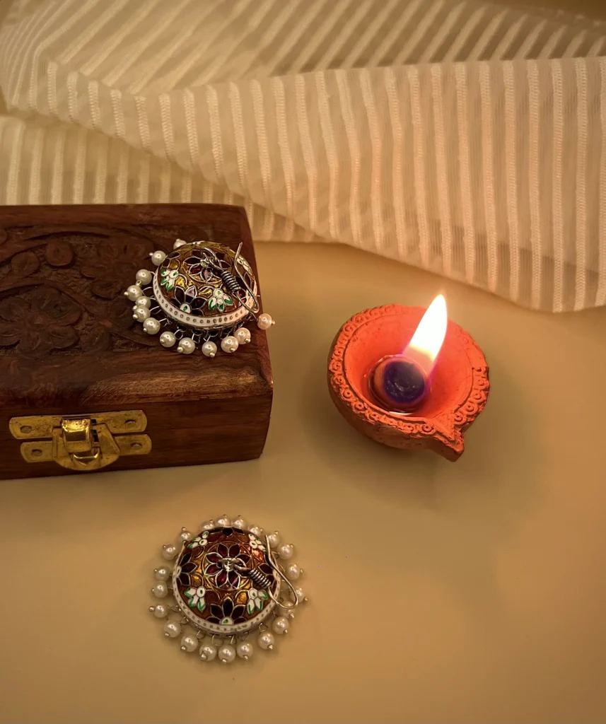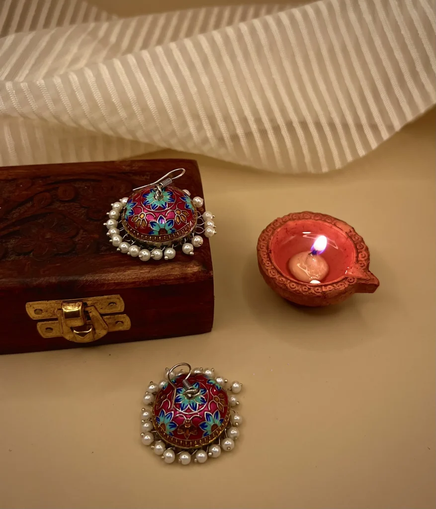 Ruhaniyat Mehroon – Mehendi Polish Enameled Bell Jhumka