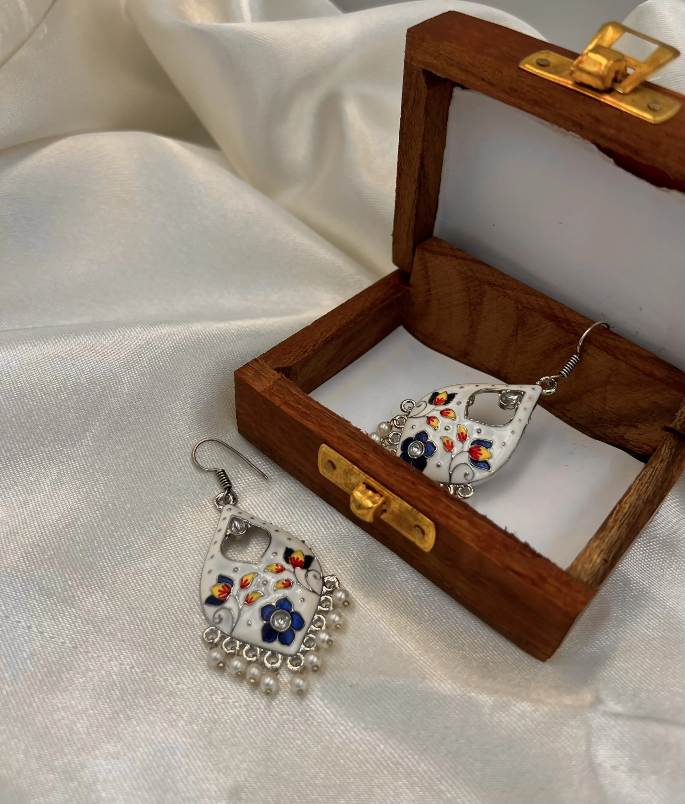 Behold Chitta Miraya, an enchanting pair of Meenakari jhumkas that are a testament to exquisite craftsmanship. These earrings are adorned with a pristine white enamel base, featuring delicate blue and deep pink floral motifs. The cluster of delicate pearls hanging from the base adds a touch of playful charm. Whether you’re dressing up a simple kurti for a day out, adding a pop of color to your short kurti ensemble, or completing your look for a traditional suit or saree, these jhumkas are designed to complement any outfit, making them perfect for every occasion.