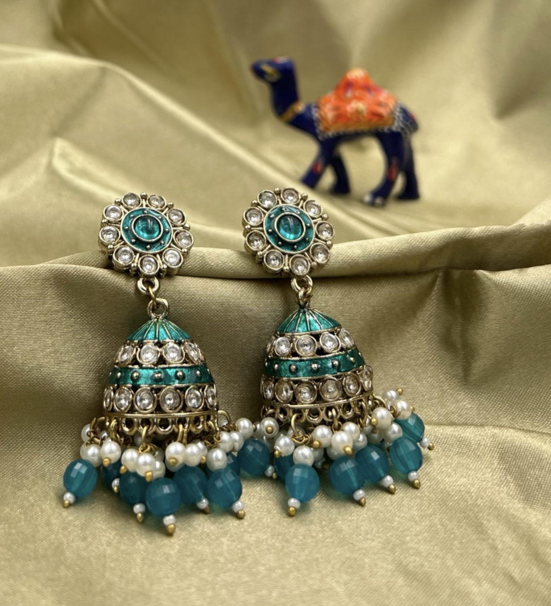 - Design: Intricate enamelled top and bell-shaped Jhumki, secure post-back closure.