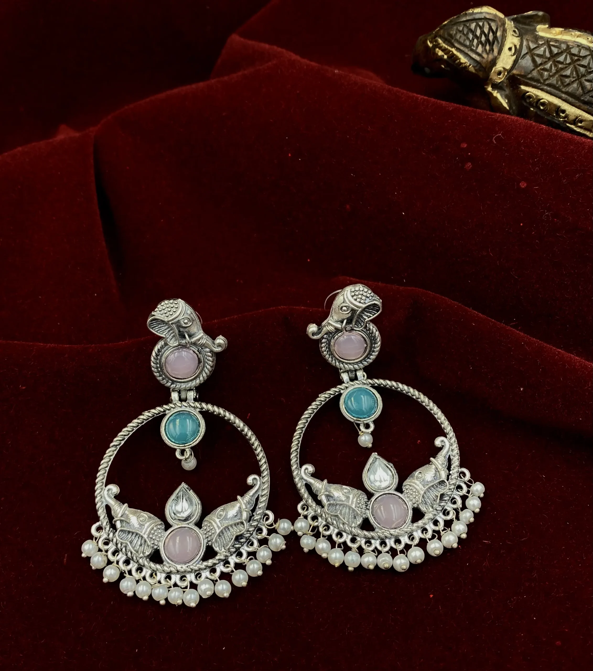 Step into majestic charm with Gajraj Kundal Gulabi & Neela, a captivating and unique pair of oxidised earrings. Crafted with an antique silver-tone finish, these exquisite pieces feature intricate elephant motifs (‘Gajraj’), leading to a circular hoop (‘Kundal’). Adorned with luminous pink and light blue stones (‘Gulabi & Neela’), they create a captivating aura. Delicate pearls cascade below, enhancing their regal allure. Perfect for those seeking distinct artistry, Gajraj Kundal effortlessly elevates any ensemble, from traditional to modern fusion wear, ensuring a statement of grace and sophistication.