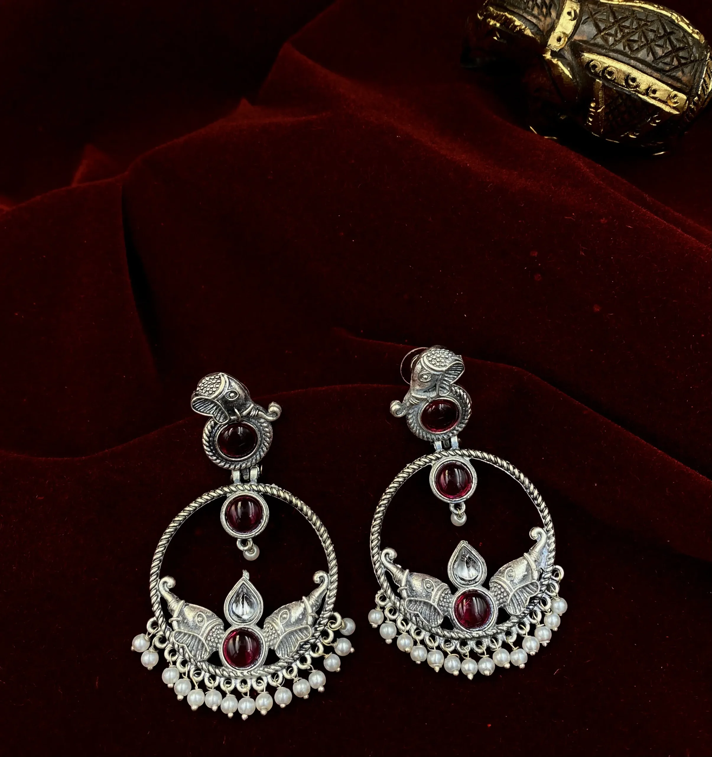 Step into majestic charm with Gajraj Kundal Raktam, a captivating and unique pair of oxidised earrings. Crafted with an antique silver-tone finish, these exquisite pieces feature intricate elephant motifs (‘Gajraj’), leading to a circular hoop (‘Kundal’). Adorned with luminous red stones (‘Raktam’ – symbolizing a rich, vibrant crimson hue), they create a captivating aura. Delicate pearls cascade below, enhancing their regal allure. Perfect for those seeking distinct artistry, Gajraj Kundal effortlessly elevates any ensemble, from traditional to modern fusion wear, ensuring a statement of grace and sophistication.