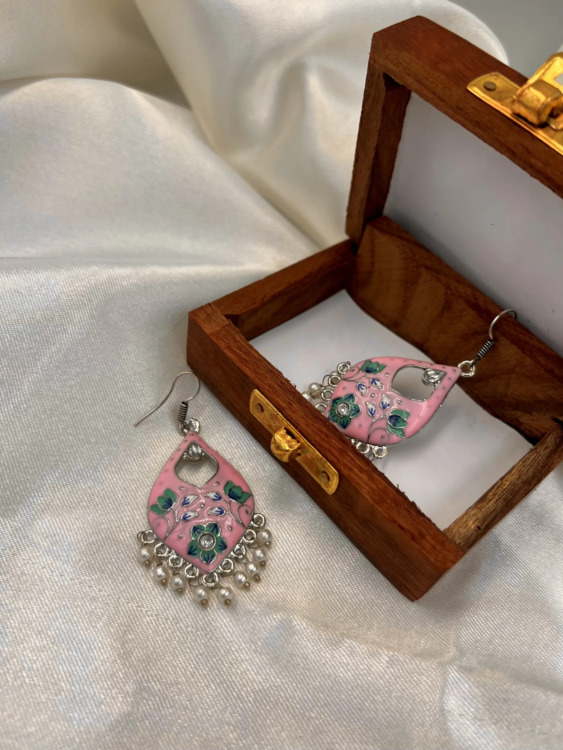 Behold Gulabi Miraya, an enchanting pair of Meenakari jhumkas that are a testament to exquisite craftsmanship. These earrings are adorned with a soft pink enamel base, featuring delicate white,and green floral motifs. The cluster of delicate pearls hanging from the base adds a touch of playful charm. Whether you’re dressing up a simple kurti for a day out, adding a pop of color to your short kurti ensemble, or completing your look for a traditional suit or saree, these jhumkas are designed to complement any outfit, making them perfect for every occasion.