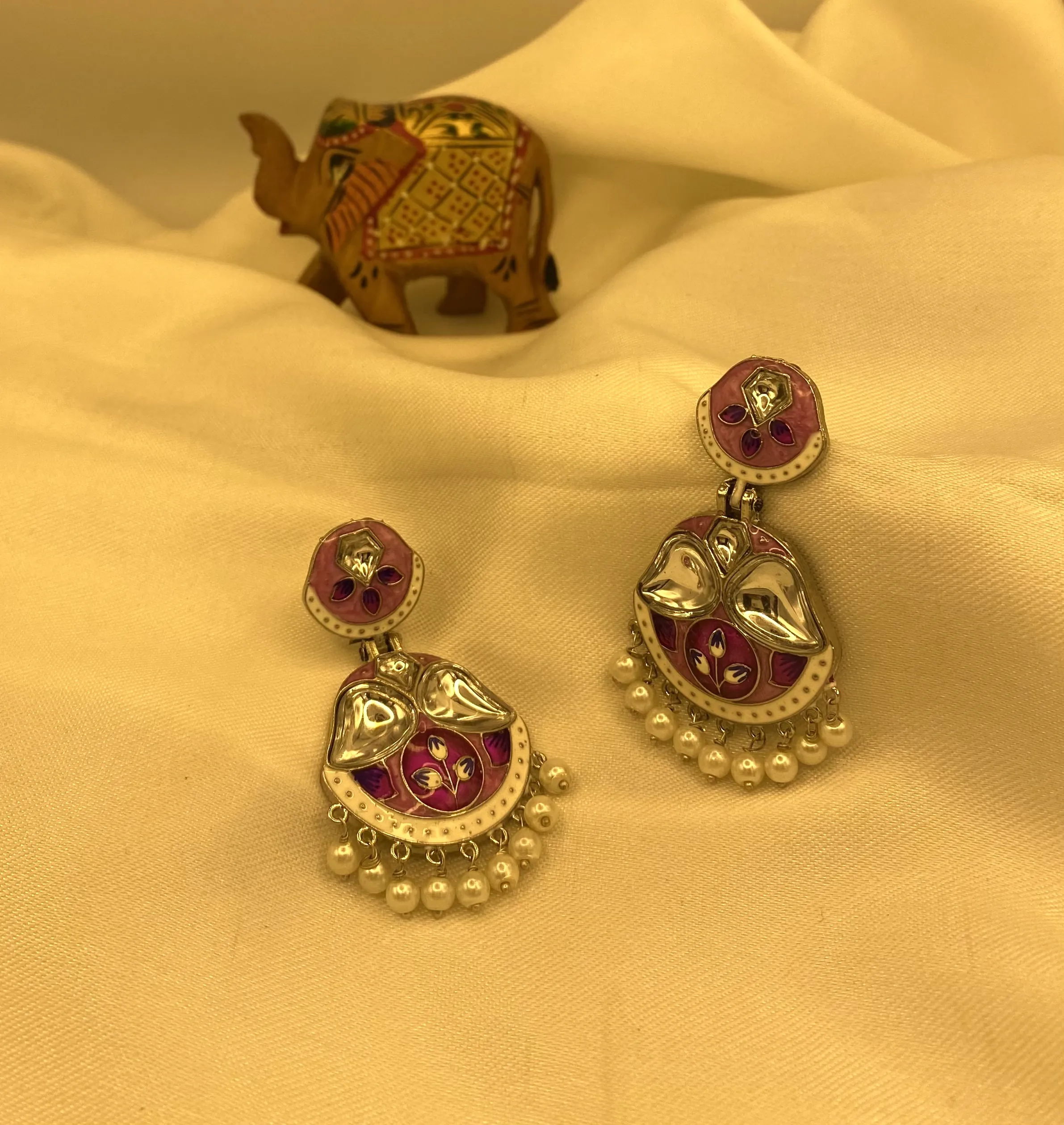 Introducing Gulal Sanjogta, a beautiful pair of handcrafted Meenakari jhumkas. These earrings feature a charming deep pink enamel base, adorned with intricate white and pink floral patterns. The delicate pearl drops and subtle sparkling stones add a touch of elegance, making them the perfect accessory to elevate your daily style or add a pop of color for any occasion, from an everyday look to a special festive day.