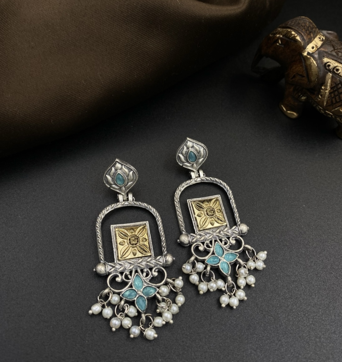 Step through Jharokha Firoza Darshan and discover a window to timeless beauty and royal grace. These exquisite anti-tarnish earrings are meticulously crafted with a stunning two-tone (golden and silver) finish, designed to maintain their brilliant luster through years of cherished wear. Inspired by traditional architectural ‘jharokhas’, each piece features an intricate frame adorned with delicate touches of turquoise (our ‘Firoza Darshan’ – meaning ‘Turquoise Sight’ or ‘View of Turquoise’, evoking the precious gemstone’s vibrant hue). This subtle, evocative hue complements the antique metals, creating an aura of understated elegance. Perfect for elevating any ensemble, Jharokha Firoza Darshan promises enduring charm and a connection to regal heritage, ensuring you carry a piece of history with modern resilience.