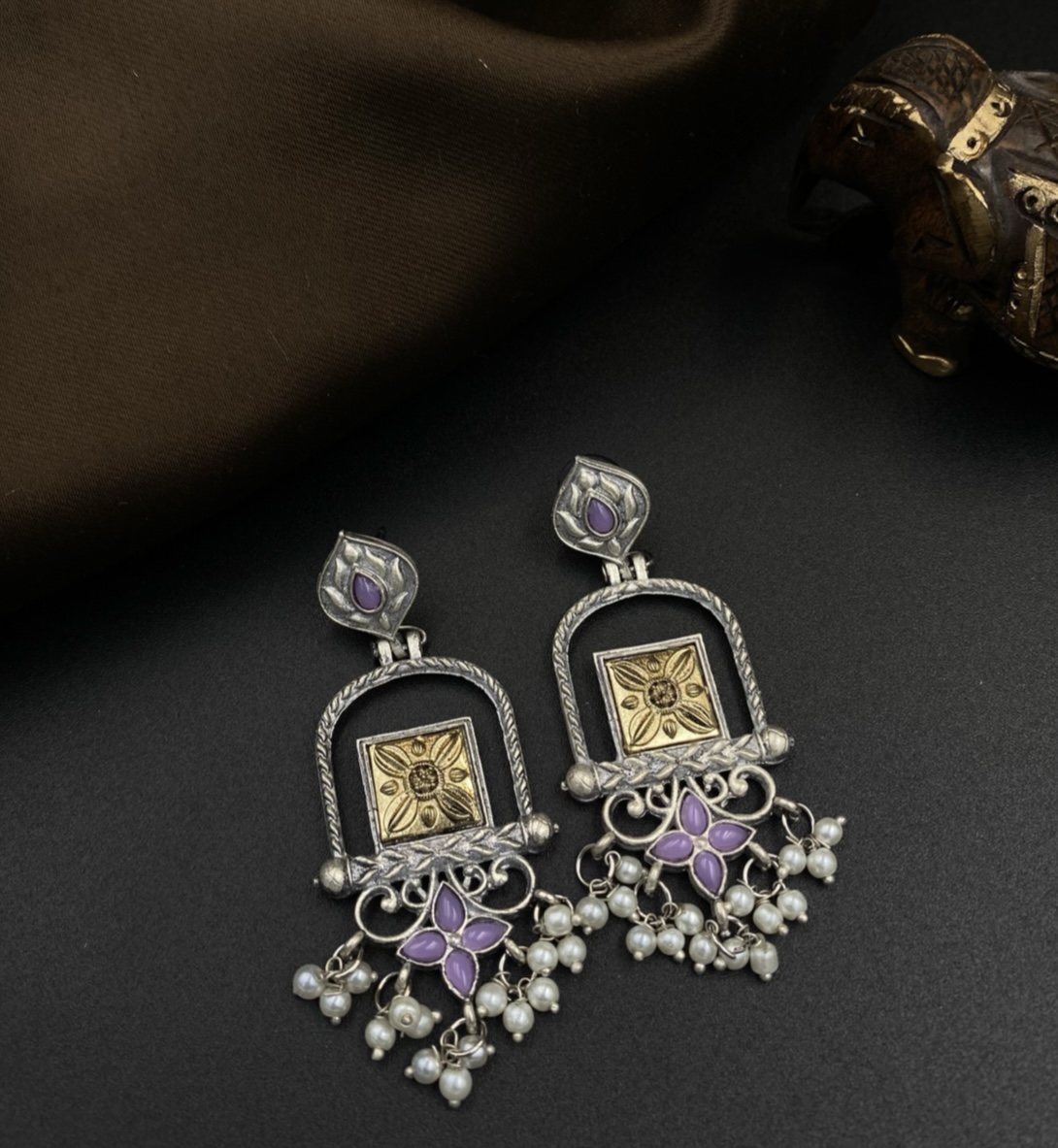 Step through Jharokha Shahi Rung and discover a window to timeless beauty and royal grace. These exquisite anti-tarnish earrings are meticulously crafted with a stunning two-tone (golden and silver) finish, designed to maintain their brilliant luster through years of cherished wear.I nspired by traditional architectural ‘jharokhas’, each piece features an intricate frame adorned with delicate touches of purple/lavender (our ‘Shahi Rung’ – meaning ‘Royal Color’, evoking the majestic hues of nobility). This subtle, evocative hue complements the antique metals, creating an aura of understated elegance. Perfect for elevating any ensemble, Jharokha Shahi Rung promises enduring charm and a connection to regal heritage, ensuring you carry a piece of history with modern resilience.