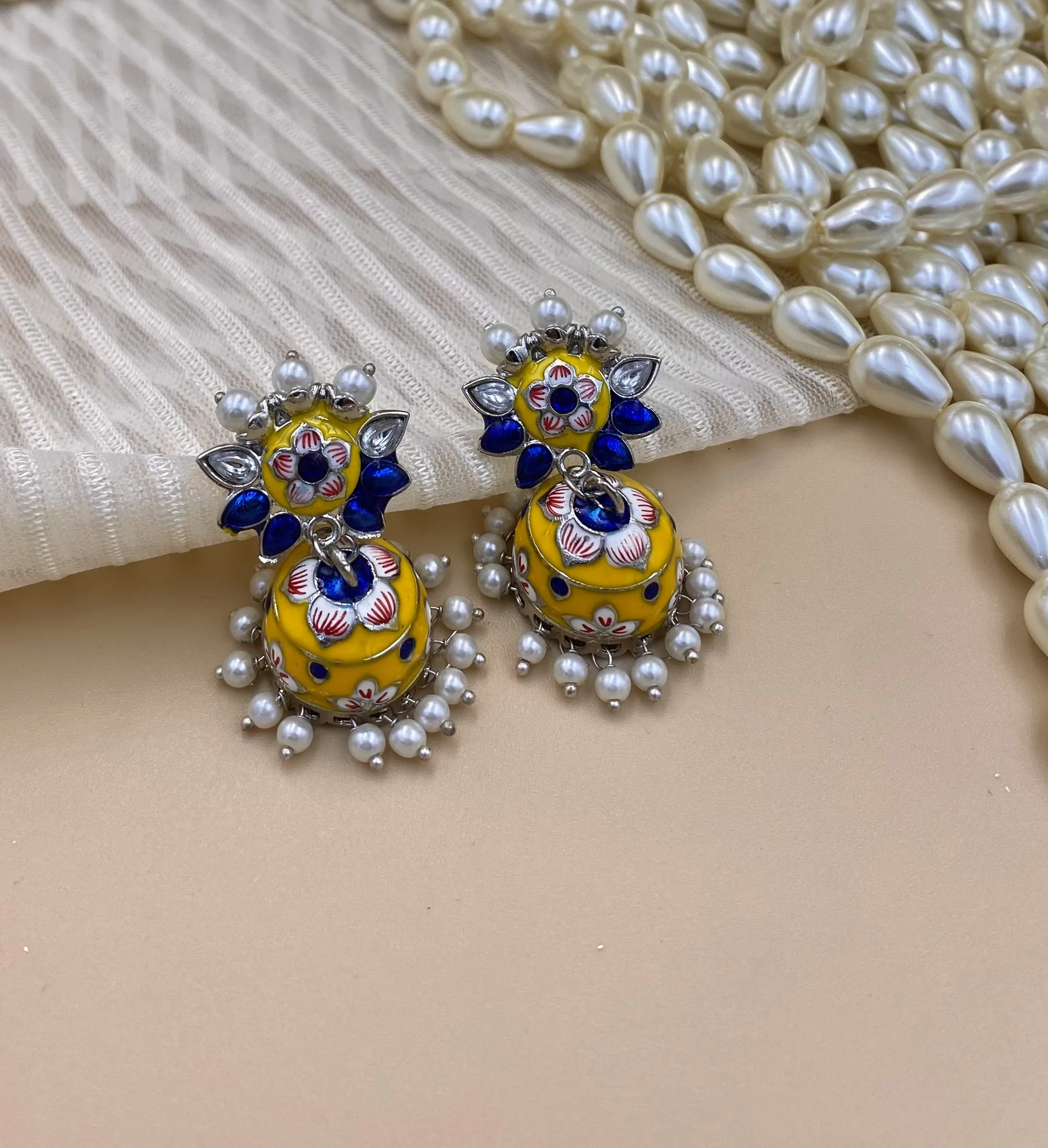 Introducing Kesariya Rangzaadi, a miniature work of art and a celebration of exquisite craftsmanship. This stunning pair of handcrafted Meenakari jhumka features a beautiful vibrant yellow enamel base, intricately detailed with bright blue and magenta floral patterns. Finished with a crown of sparkling stones and a delicate fringe of white pearl drops, these jhumkas are a breathtakingly elegant accessory for any special occasion.