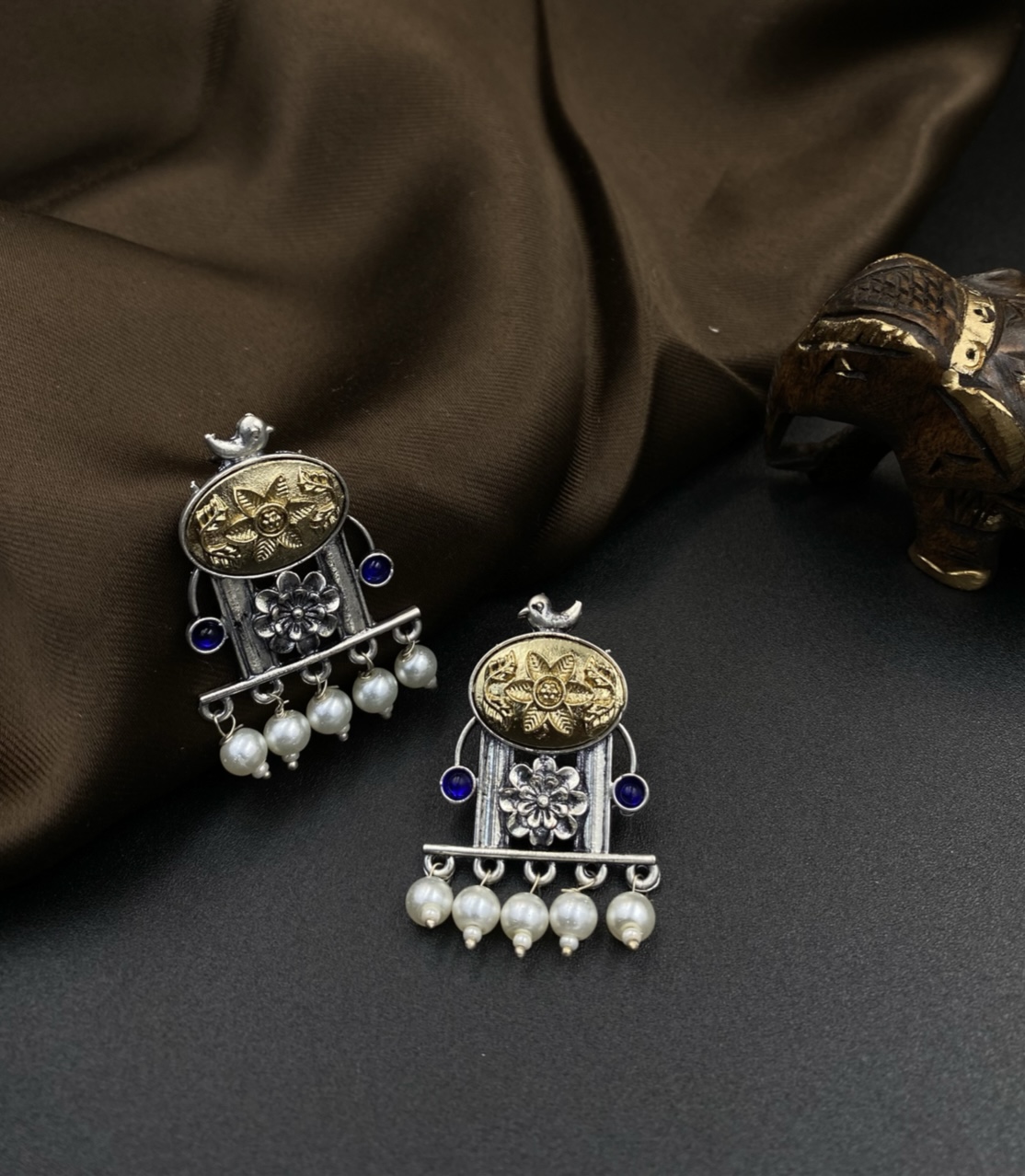 Introducing Komolika Akasha Dhwani, a testament to timeless elegance and enduring beauty. Crafted with an advanced anti-tarnish coating, these jhumkas promise to retain their radiant shimmer, making them a worry-free addition to your cherished collection. The two-tone (golden and silver) finish provides a rustic charm, while delicate whispers of blue (our ‘Akasha Dhwani’ – meaning ‘Echo of the Sky’) are artfully integrated into the design, subtly enhancing its intricate patterns. Each piece is adorned with lustrous white pearls, adding a classic touch to its unique appeal. Designed for effortless sophistication, these jhumkas transition seamlessly from your everyday wear to a captivating accent for any special occasion, ensuring you always shine with understated grace.