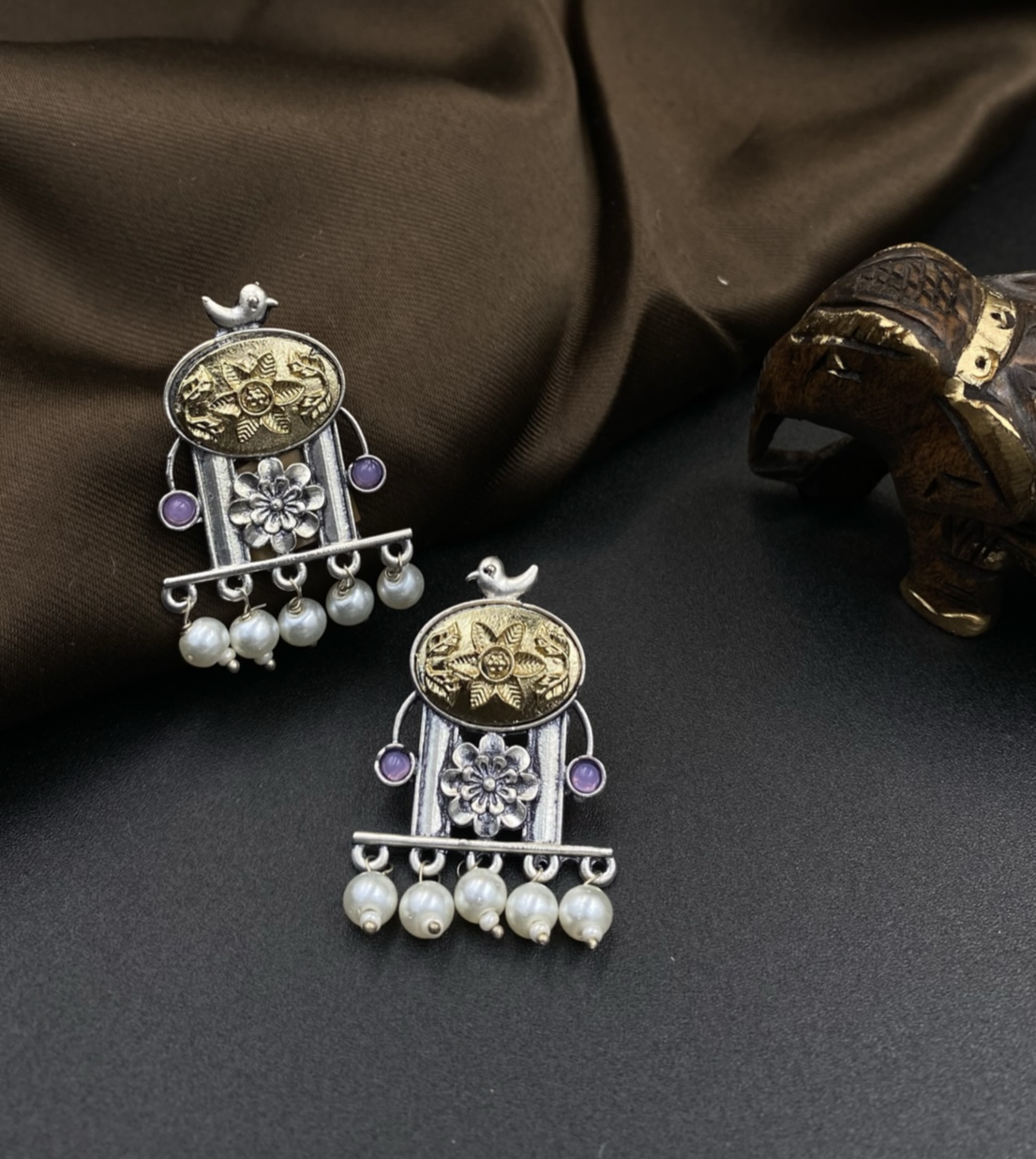 Introducing Komolika Jamuni Hues, a testament to timeless elegance and enduring beauty. Crafted with an advanced anti-tarnish coating, these jhumkas promise to retain their radiant shimmer, making them a worry-free addition to your cherished collection. The two-tone (golden and silver) finish provides a rustic charm, while delicate whispers of purple/lavender (our ‘Jamuni Hues’ – meaning ‘Purple/Violet Tones’) are artfully integrated into the design, subtly enhancing its intricate patterns. Each piece is adorned with lustrous white pearls, adding a classic touch to its unique appeal. Designed for effortless sophistication, these jhumkas transition seamlessly from your everyday wear to a captivating accent for any special occasion, ensuring you always shine with understated grace.