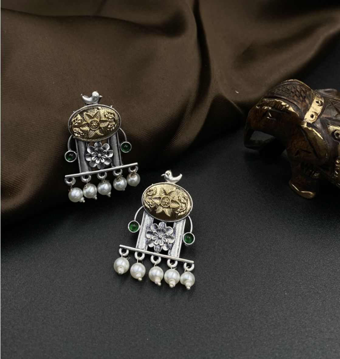 Introducing Komolika Panna, a testament to timeless elegance and enduring beauty. Crafted with an advanced anti-tarnish coating, these jhumkas promise to retain their radiant shimmer, making them a worry-free addition to your cherished collection. The two-tone (golden and silver) finish provides a rustic charm, while delicate whispers of green (our ‘Panna’ – meaning ‘Dark Green Peace/Tranquil Green’) are artfully integrated into the design, subtly enhancing its intricate patterns. Each piece is adorned with lustrous white pearls, adding a classic touch to its unique appeal. Designed for effortless sophistication, these jhumkas transition seamlessly from your everyday wear to a captivating accent for any special occasion, ensuring you always shine with understated grace.