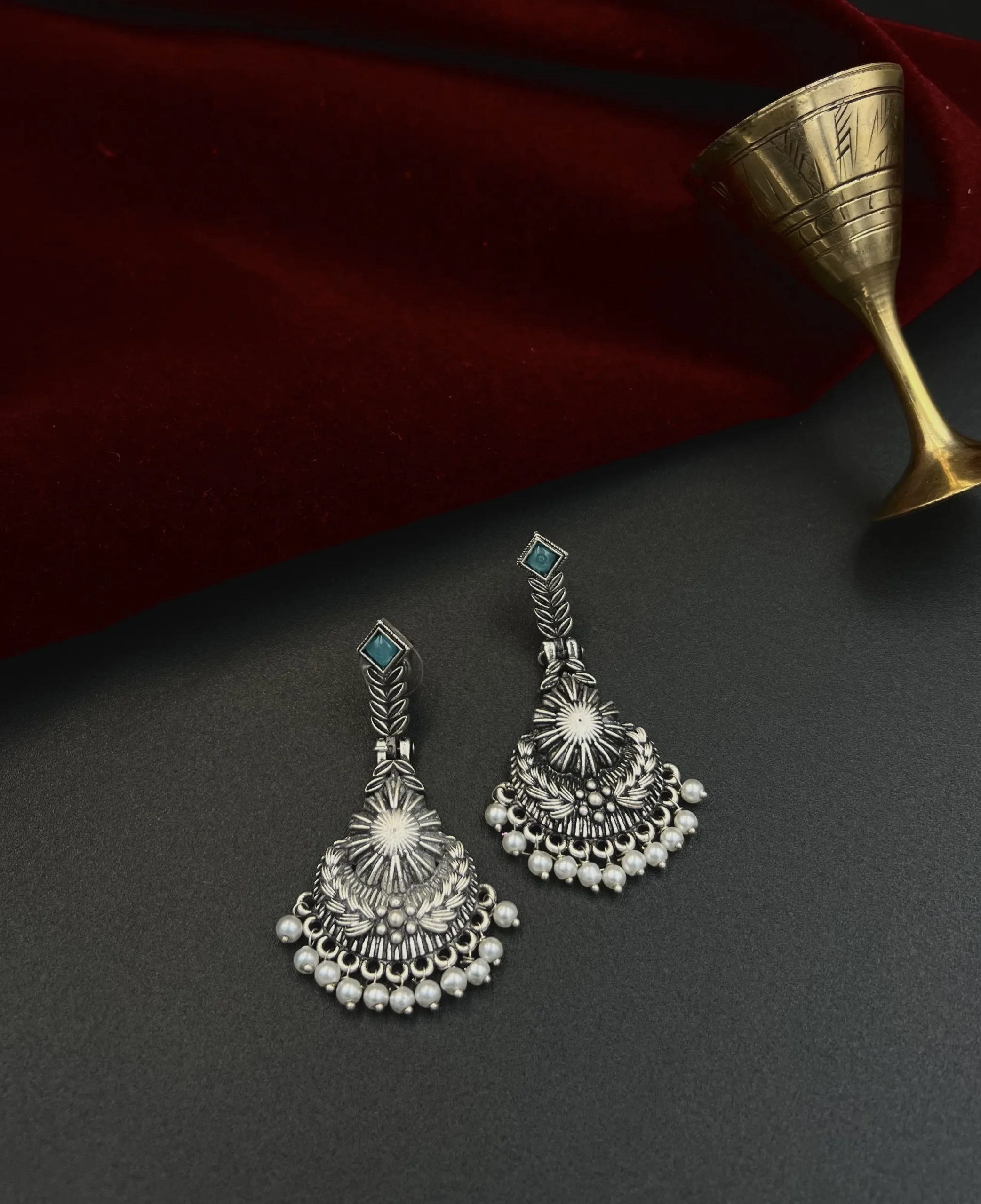 Step into the rhythmic grace of tradition with Lavani Firozi, a truly captivating and unique pair of oxidised earrings. Meticulously crafted with a distinct antique silver-tone finish, these exquisite pieces feature a prominent bell-shaped jhumka, richly detailed with intricate floral and sunburst-like patterns, reminiscent of the vibrant artistry found in the Lavani folk dance of Maharashtra. The ornate top resembles a mangtika’s central pendant, gracefully crowning the jhumka, and is accented by a single, luminous light blue/turquoise stone (our ‘Firozi’ – symbolizing the refreshing turquoise hue). A delicate cascade of luminous white pearls sways beneath, enhancing the regal allure and fluid movement of the design, much like a dancer’s rhythmic bells. Perfect for those who seek to wear a statement piece that speaks volumes of cultural richness and artistic balance, The Lavani Jhumka effortlessly enhances any ensemble, bringing a unique blend of heritage and captivating grace.