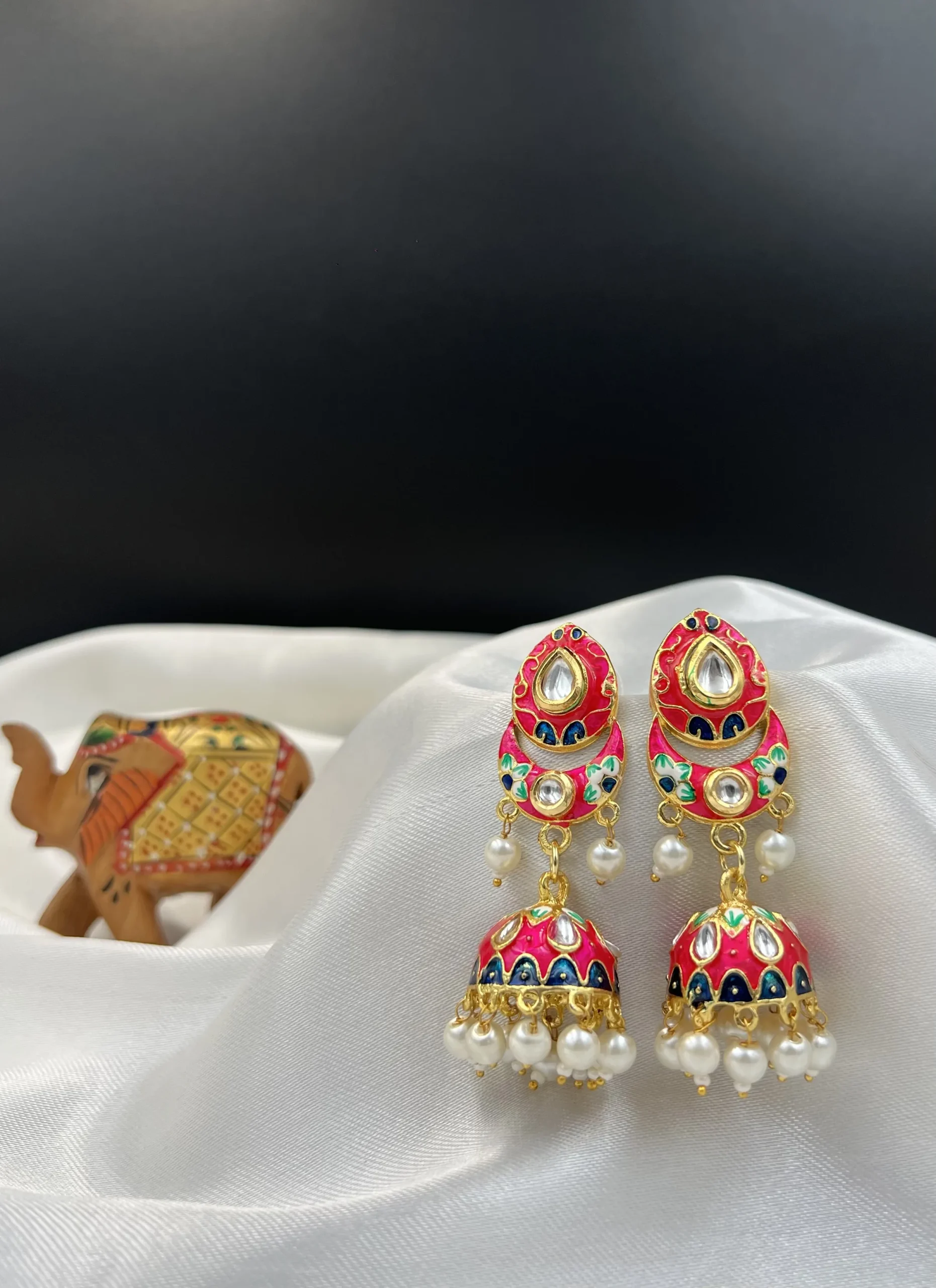 - Evara Gulabi Noor Jhumka: This beautiful bell Jhumka are your declaration of style—A Contemporary and Chic Piece that has a sophisticated feel. The vibrant Gulabi (pink) enamel is full of youthful energy (Evara), bringing a spark of fun and color to your daily look without compromising on elegance.