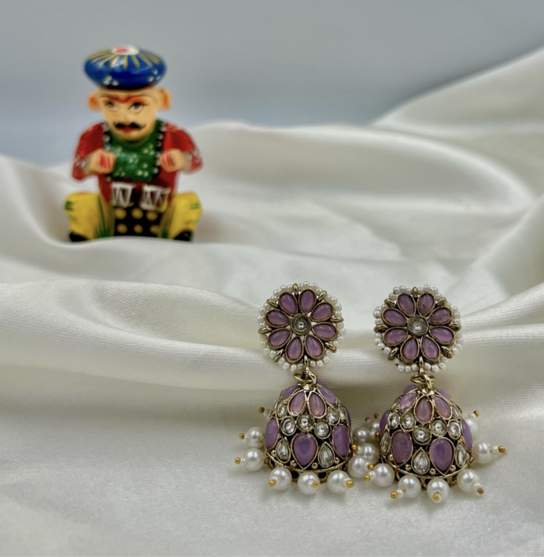 Discover the artistry of Masakali Lavangini Jhumki, a truly enchanting pair of handcrafted Mehendi Polish earrings. Each piece is a testament to meticulous craftsmanship, featuring a delicate floral top adorned with brilliant lavender stones. This leads gracefully to a detailed bell-shaped Jhumki, further embellished with more sparkling lavender stones and a captivating cascade of luminous white pearls. These versatile Jhumkis are designed to be your signature accessory, effortlessly enhancing any look – from casual everyday charm and contemporary Indo-Western flair to the grandeur of festive celebrations.