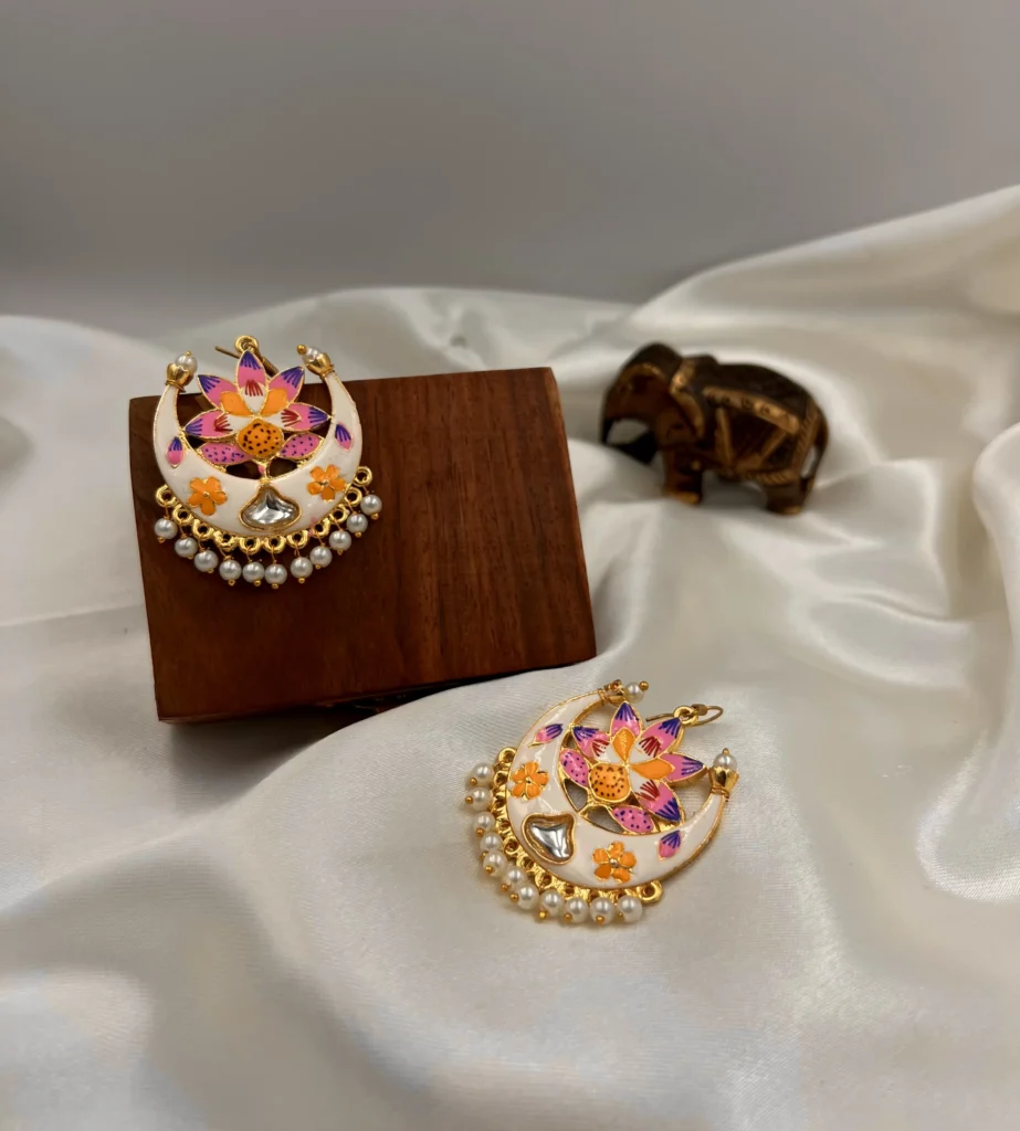 To preserve the exceptional anti-tarnish finish of your Mayur Mahal earrings, store them in an airtight pouch away from moisture and direct sunlight. Gently wipe with a soft, dry cloth only when necessary. Avoid contact with perfumes, sprays, and harsh chemicals to ensure their lasting brilliance.