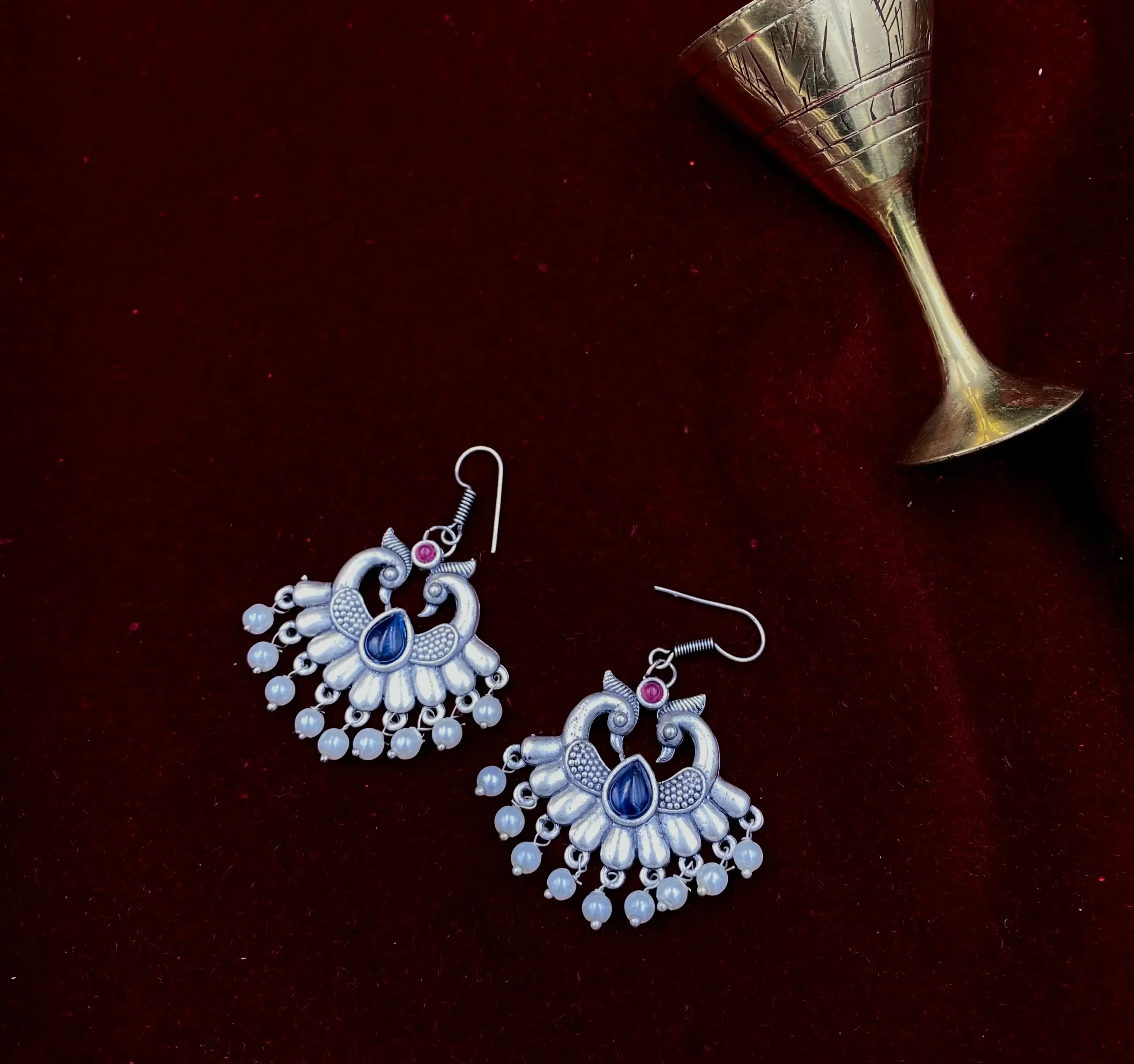 Step into an enchanting world of elegance with Mayur Nrityaki Neel Kanthi – A Dance of Grace and Pearls, a truly captivating pair of oxidised earrings. Meticulously crafted with a distinct antique silver-tone finish, these unique pieces feature an intricately detailed peacock motif (‘Mayur’ – symbolizing grace and beauty) that extends into a charming, fan-like lower design, reminiscent of a peacock’s elegant ‘Nrityaki’ (dance). The peacocks are beautifully accented with a central, luminous dark blue stone (our ‘Neel Kanthi’ – evoking the rich, profound color of a sapphire gemstone). A cascade of luminous white pearls gracefully sways beneath, enhancing the regal allure and fluid movement of the design. Perfect for those who seek a statement piece that speaks volumes of artistic expression and timeless beauty, Mayur Nrityaki Neel Kanthi effortlessly enhances any ensemble, bringing a unique blend of tradition and captivating grace.
