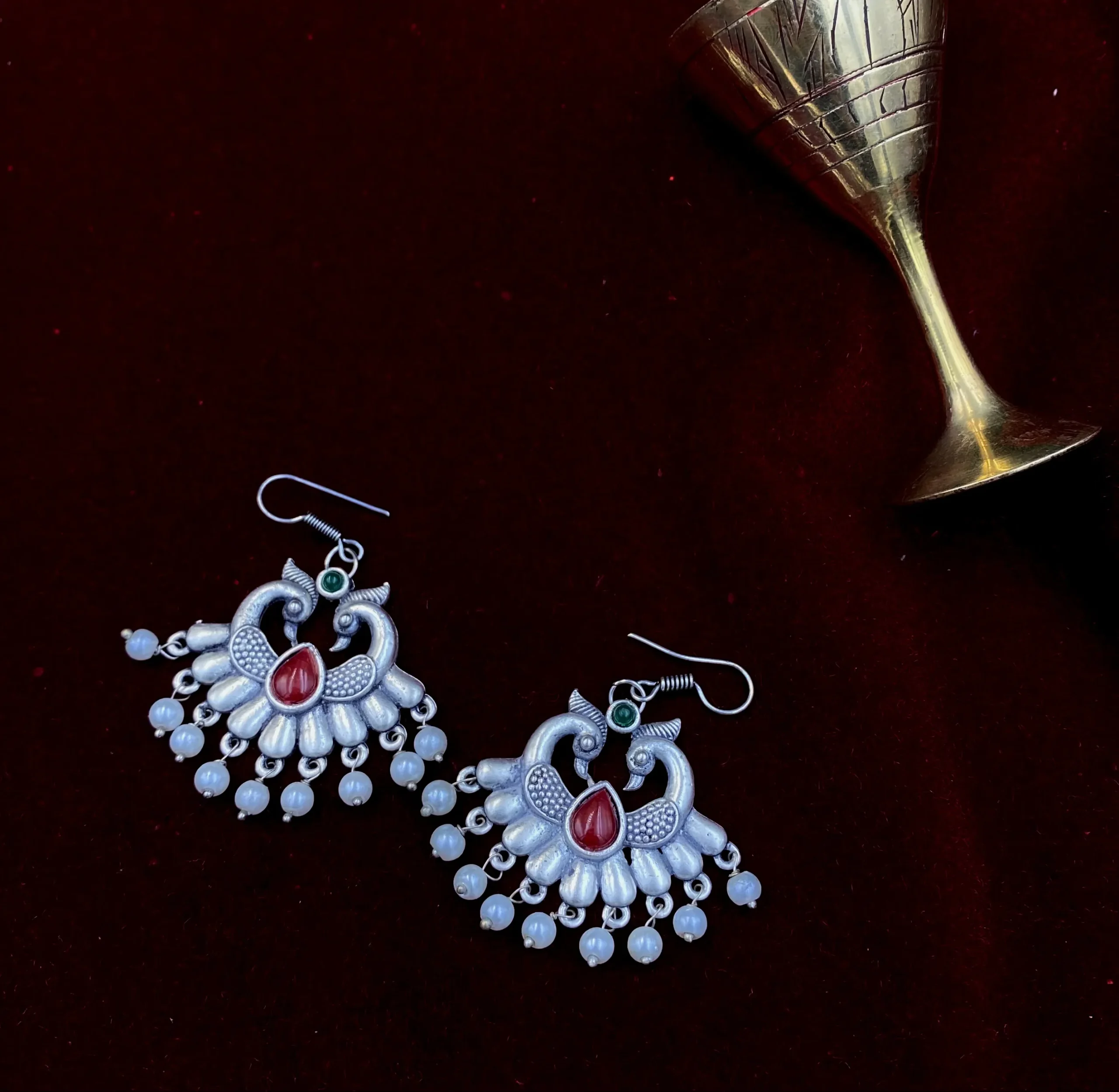 Step into an enchanting world of elegance with Mayur Nrityaki Sindoori – A Dance of Grace and Pearls, a truly captivating pair of oxidised earrings. Meticulously crafted with a distinct antique silver-tone finish, these unique pieces feature an intricately detailed peacock motif (‘Mayur’ – symbolizing grace and beauty) that extends into a charming, fan-like lower design, reminiscent of a peacock’s elegant ‘Nrityaki’ (dance). The peacocks are beautifully accented with a central, luminous light Light Red stone(our ‘Sindoori’ – evoking the serene and mystical hue of the amethyst gemstone). A cascade of luminous white pearls gracefully sways beneath, enhancing the regal allure and fluid movement of the design. Perfect for those who seek a statement piece that speaks volumes of artistic expression and timeless beauty, Mayur Nrityaki Sindoori effortlessly enhances any ensemble, bringing a unique blend of tradition and captivating grace.