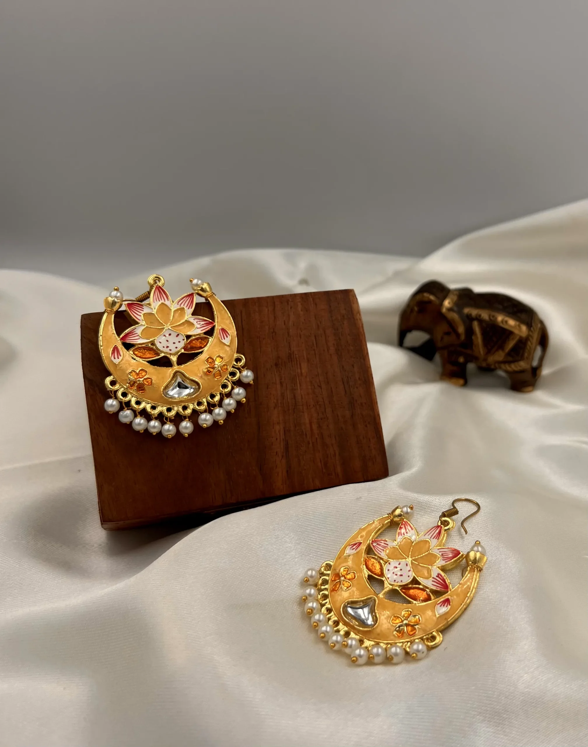 Introducing Miorah Kesariya: a radiant blend of tradition and elegance. These crescent shaped earrings are hand enameled in warm Kesar hues with a rich mehendi polish, adorned with delicate mirror and pearl detailing. Perfect for festive occasions, casual wear or wedding celebrations, they add a regal touch to any look.