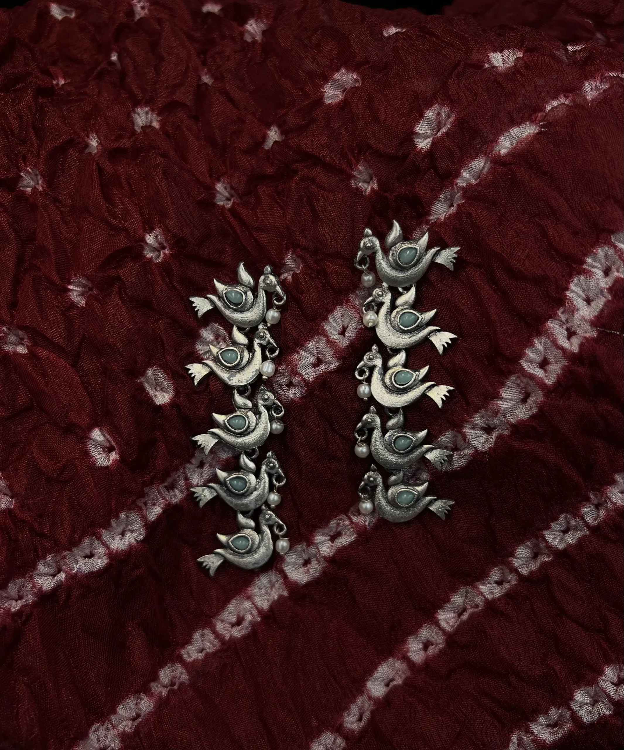 Embark on a journey of self-expression with Moksha Morpankhi – Flight of Freedom earrings, a captivating emblem of liberation and grace. Crafted with authentic oxidised silver-tone artistry, these unique pieces offer a distinct antique charm. Each intricately detailed bird motif, symbolizing unburdened spirit, is subtly adorned with a rich, vibrant hue (our ‘Morpankhi’ – meaning ‘Peacock Feather’, evoking the iridescent green-blue tones of a peacock’s plumage). This minimalist color accent adds a contemporary twist to the traditional design, making these earrings a versatile statement piece. Perfect for those who seek to define their own style, Moksha Morpankhi – Flight of Freedom offers timeless elegance with a touch of modern individuality, ensuring you stand out with effortless grace.