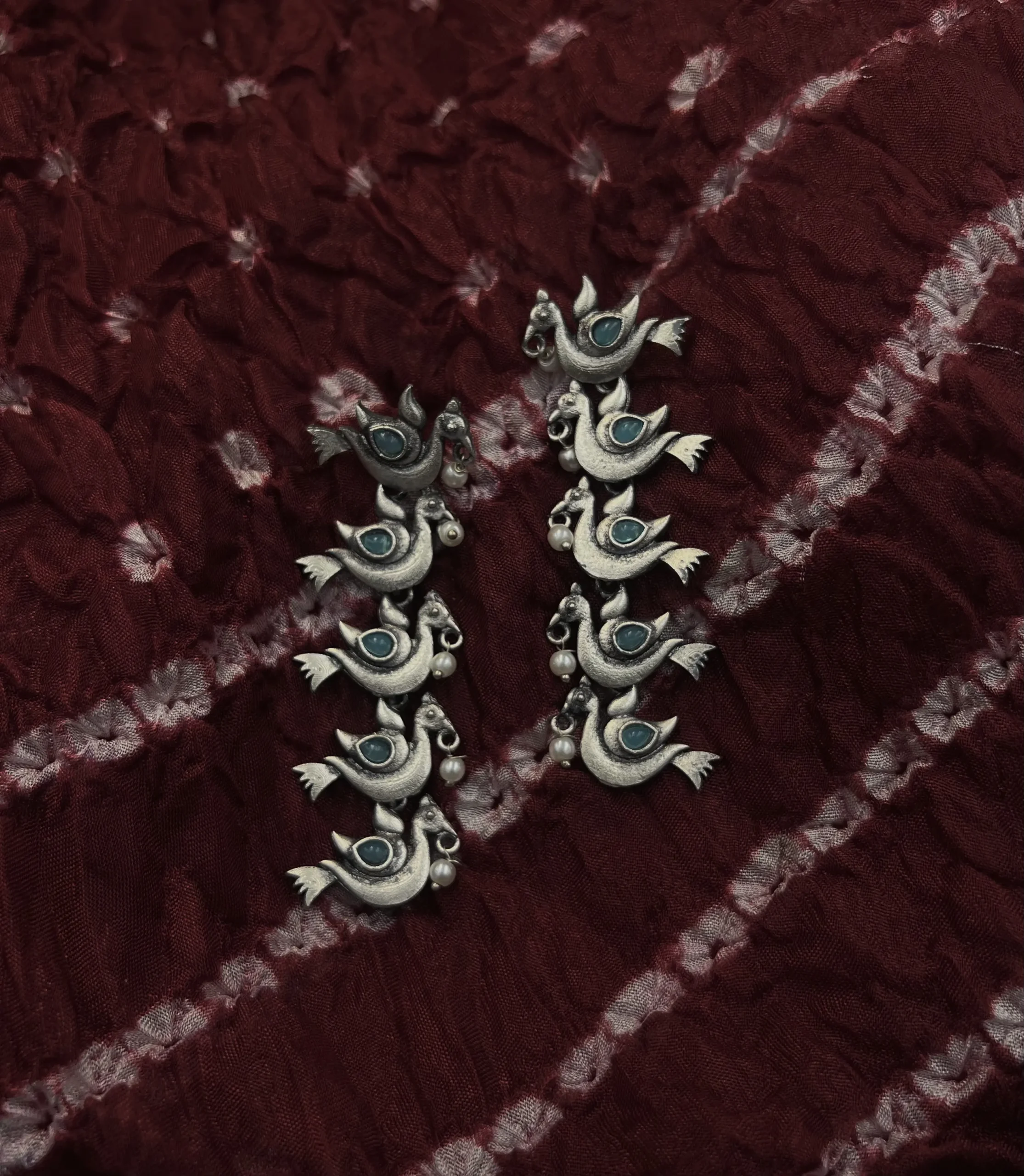 - Design: Multiple bird motifs arranged in a linear drop, secure post-back closure.