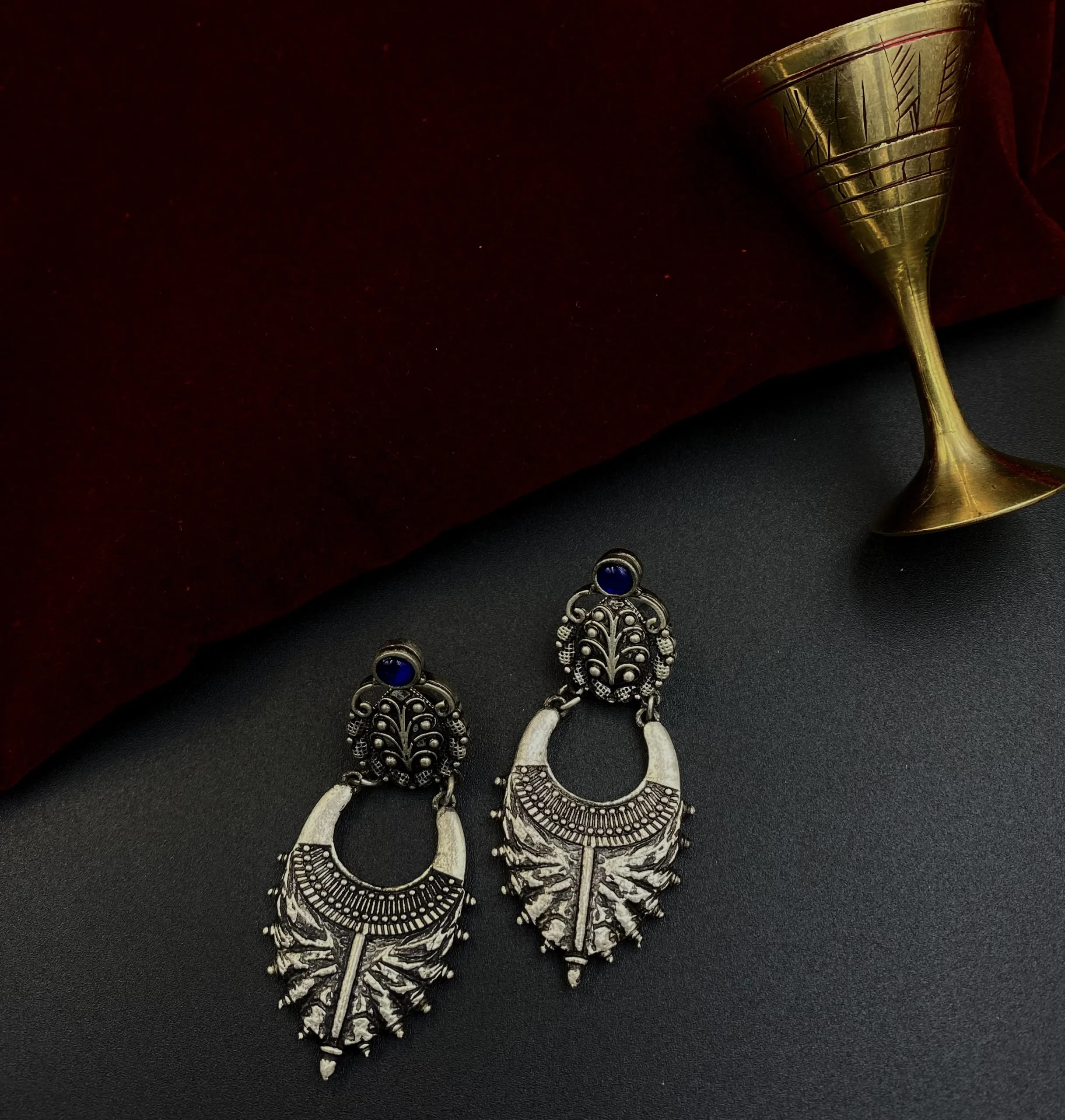 Adorn yourself with Nalini Akash Ganga – A Lotus Bloom of Radiance, a truly captivating and ly unique pair of oxidised earrings. Meticulously crafted with a distinct antique silver-tone finish, these exquisite pieces feature a prominent multi-layered, petal-like design at the base, reminiscent of a thousand-petaled lotus (‘Nalini’). The intricate detailing on its surface catches the light beautifully, creating an aura of regal elegance. The earrings are accented with a small, luminous dark blue stone at the top (our ‘Akash Ganga’ – evoking the vast, deep blue of the celestial river or Milky Way, a unique and profound hue). Perfect for those who seek to add a touch of traditional artistry and a harmonious blend of nature’s beauty to their ensemble, these jhumkas effortlessly enhance any look, from everyday elegance to special festive occasions, ensuring you carry an echo of beauty with every movement.