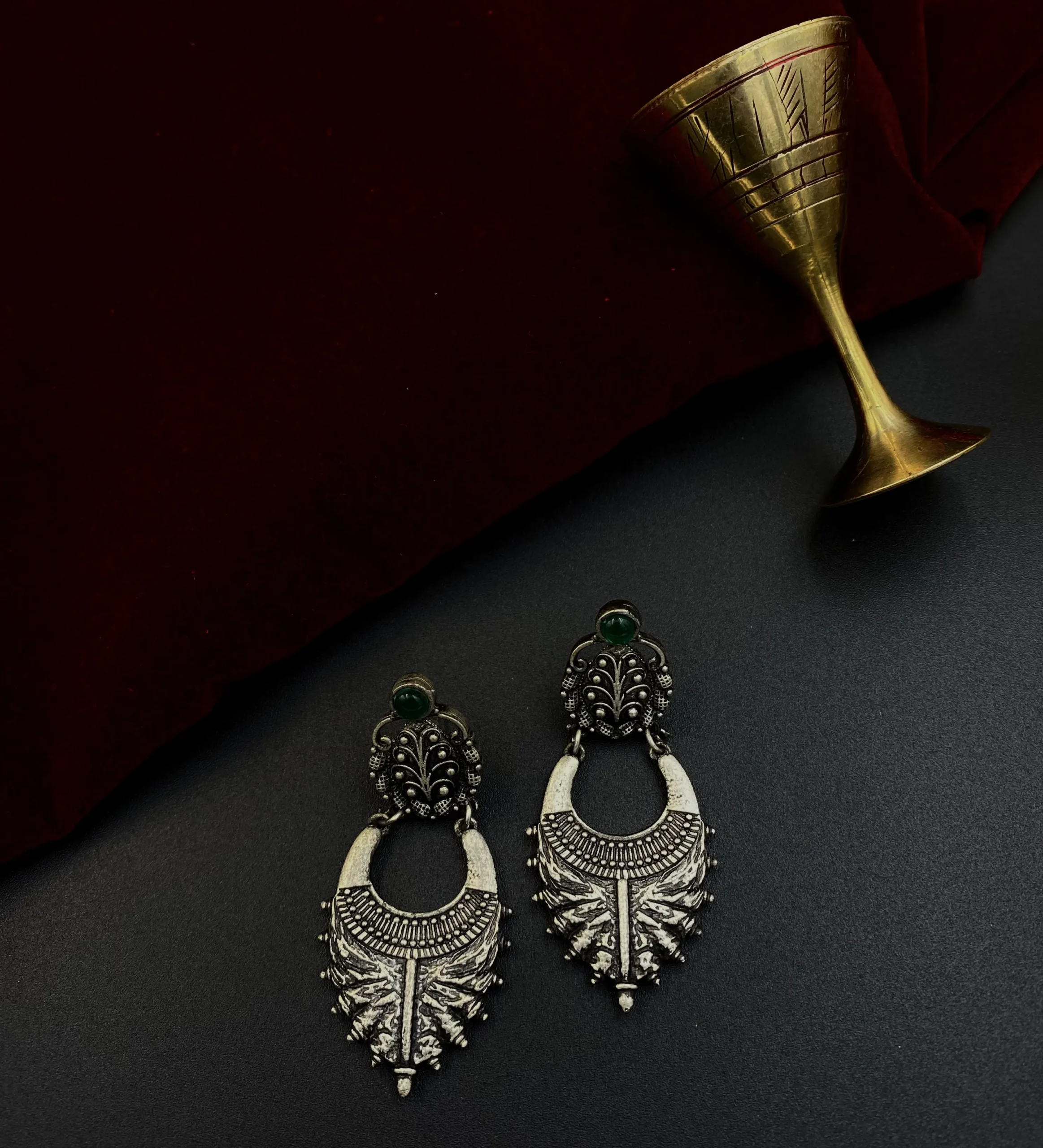 Adorn yourself with Nalini Harit – A Lotus Bloom of Radiance, a truly captivating and ly unique pair of oxidised earrings. Meticulously crafted with a distinct antique silver-tone finish, these exquisite pieces feature a prominent multi-layered, petal-like design at the base, reminiscent of a thousand-petaled lotus (‘Nalini’). The intricate detailing on its surface catches the light beautifully, creating an aura of regal elegance. The earrings are accented with a small, luminous dark green stone at the top (our ‘Harit’ – evoking the vibrant, deep green of emerald gemstones). Perfect for those who seek to add a touch of traditional artistry and a harmonious blend of nature’s beauty to their ensemble, these jhumkas effortlessly enhance any look, from everyday elegance to special festive occasions, ensuring you carry an echo of beauty with every movement.