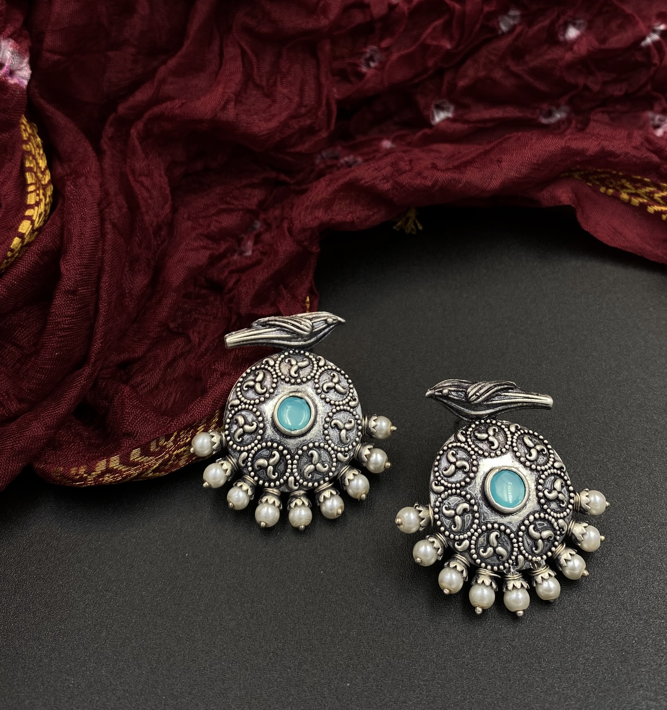 Discover Pakshi Mandala Firozi, a truly captivating and unique pair of oxidised earrings that embody tranquil artistry. Meticulously crafted with a distinct antique silver-tone finish, these exquisite pieces feature a graceful bird motif at the top, elegantly perched above a prominent circular disc (‘Mandala’ – evoking sacred geometry and holistic design). The circular element is intricately detailed with traditional patterns and accented with a central, luminous light blue/turquoise stone (our ‘Firozi’ – symbolizing a serene turquoise glow). Delicate pearls gracefully sway beneath, adding a touch of classic allure and fluid movement. Perfect for those who seek to wear a statement piece that speaks volumes of peace and artistic balance, The Pakshi Mandala effortlessly enhances any ensemble, bringing a unique blend of tradition and captivating grace.