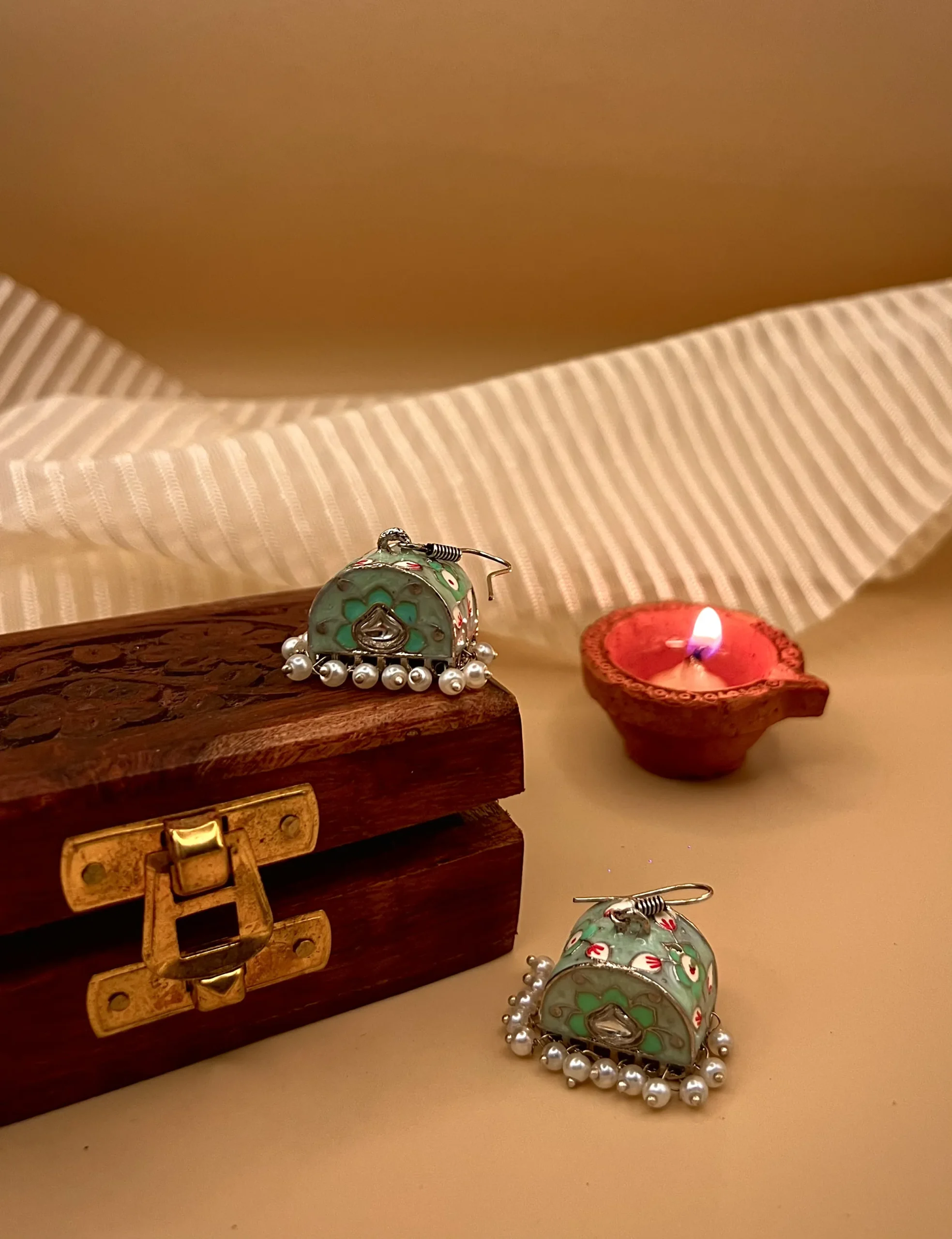 Behold Panna Chakori, an enchanting pair of Meenakari jhumkas that are a testament to exquisite craftsmanship. These earrings feature a unique, rounded, and elegant pot-like shape, adorned with a charming green enamel base and delicate floral motifs. The cluster of delicate pearls hanging from the base adds a touch of playful charm. Whether you’re dressing up a simple kurti for a day out, adding a pop of color to your short kurti ensemble, or completing your look for a traditional suit or saree, these jhumkas are designed to complement any outfit, making them perfect for every occasion.