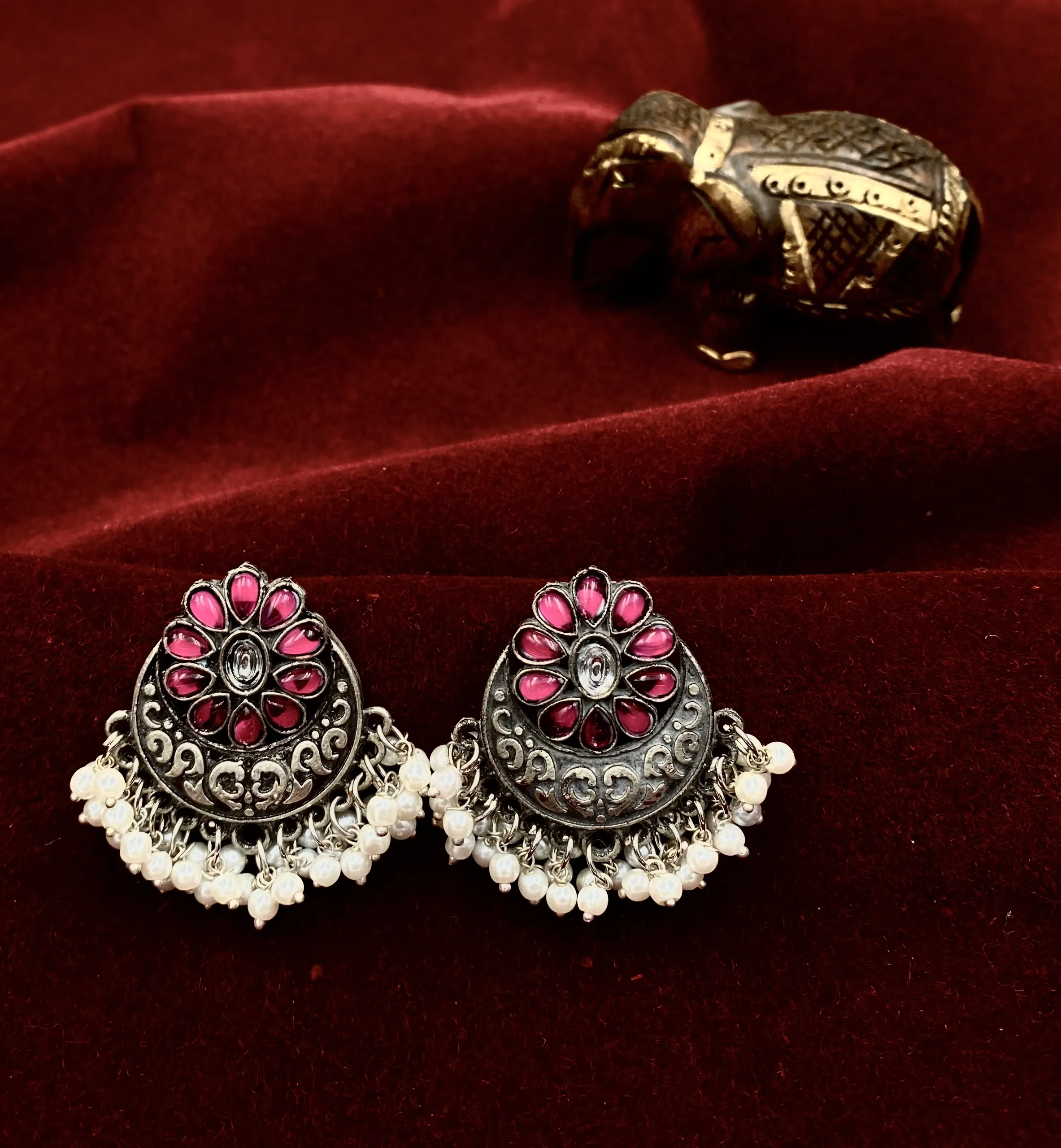 Adorn yourself with Pushpini Gulal Rang – A Blooming Radiance, a truly captivating and unique pair of oxidised earrings. Meticulously crafted with a distinct antique silver-tone finish, these exquisite pieces feature an intricate floral or petal-like design (‘Pushpini’ – evoking a beautiful bloom or blossoming flower) at the top. The central clear/white stone is elegantly surrounded by luminous dark pink/magenta accents (our ‘Gulal Rang’ – symbolizing the vibrant and joyous hues of Holi, the festival of colors, and other festive celebrations), creating a striking contrast. A delicate cascade of luminous white pearls gracefully sways beneath, enhancing the regal allure and movement. Perfect for those who seek to wear a distinct work of art that effortlessly enhances any ensemble, Pushpini Gulal Rang promises to be a cherished adornment, radiating charm and sophistication with every turn.