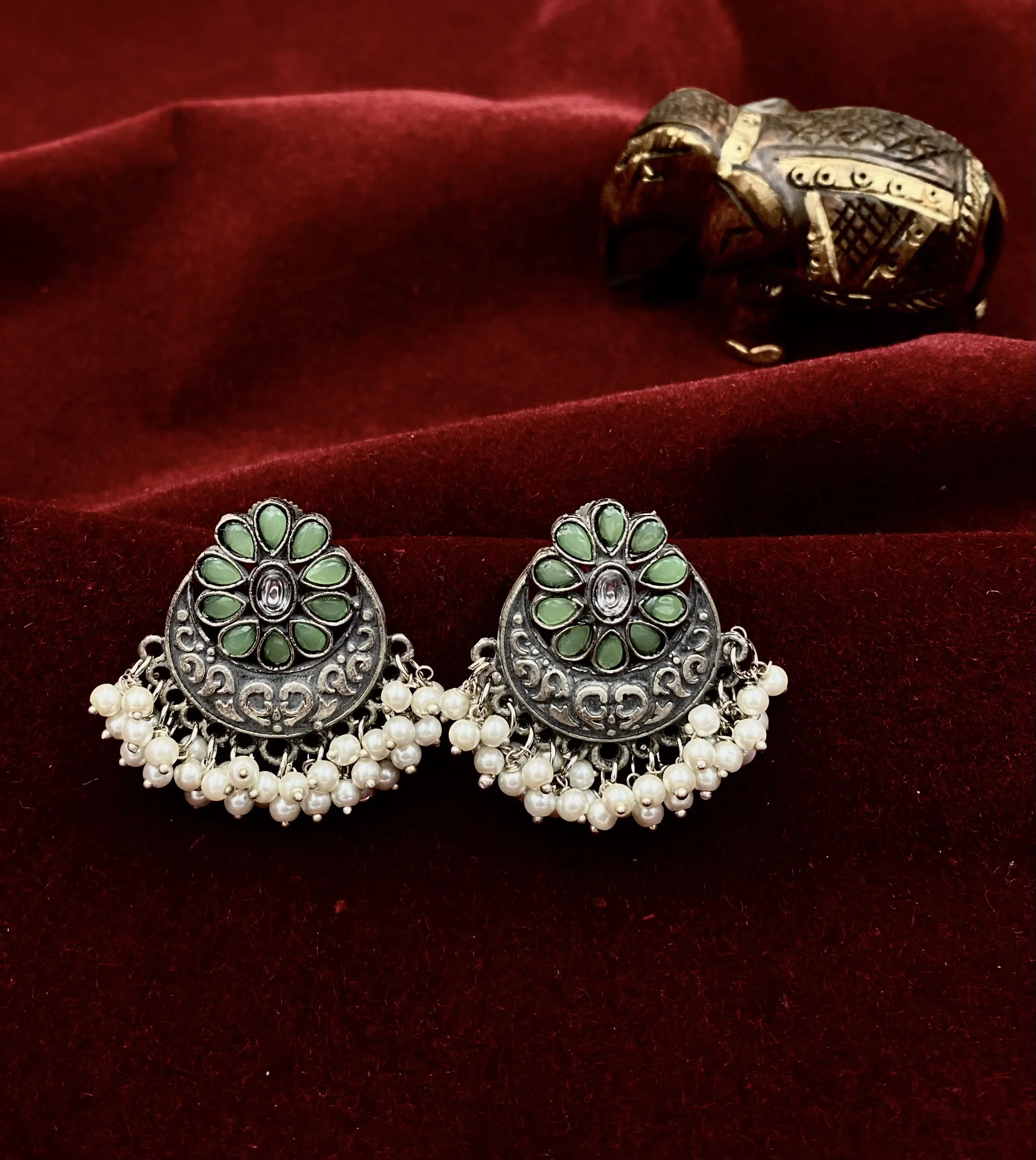 Adorn yourself with Pushpini Panna – A Blooming Radiance, a truly captivating and unique pair of oxidised earrings. Meticulously crafted with a distinct antique silver-tone finish, these exquisite pieces feature an intricate floral or petal-like design (‘Pushpini’ – evoking a beautiful bloom or blossoming flower) at the top. The central clear/white stone is elegantly surrounded by luminous light green accents (our ‘Panna’ – symbolizing the vibrant and refreshing hues of spring festivals and new beginnings), creating a striking contrast. A delicate cascade of luminous white pearls gracefully sways beneath, enhancing the regal allure and movement. Perfect for those who seek to wear a distinct work of art that effortlessly enhances any ensemble, Pushpini Panna promises to be a cherished adornment, radiating charm and sophistication with every turn.