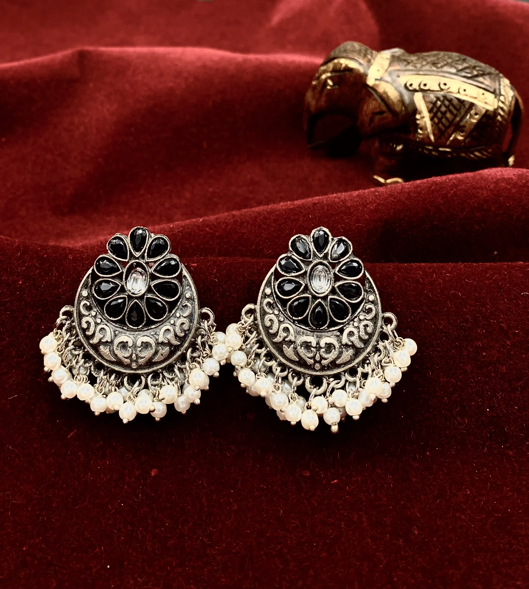 Adorn yourself with Pushpini Shyamali – A Blooming Radiance, a truly captivating and unique pair of oxidised earrings. Meticulously crafted with a distinct antique silver-tone finish, these exquisite pieces feature an intricate floral or petal-like design (‘Pushpini’ – evoking a beautiful bloom or blossoming flower) at the top. The central clear/white stone is elegantly surrounded by luminous black accents (our ‘Shyamali’ – symbolizing a dark, beautiful hue reminiscent of twilight or deep mystique), creating a striking contrast. A delicate cascade of luminous white pearls gracefully sways beneath, enhancing the regal allure and movement. Perfect for those who seek to wear a distinct work of art that effortlessly enhances any ensemble, Pushpini Shyamali promises to be a cherished adornment, radiating charm and sophistication with every turn.