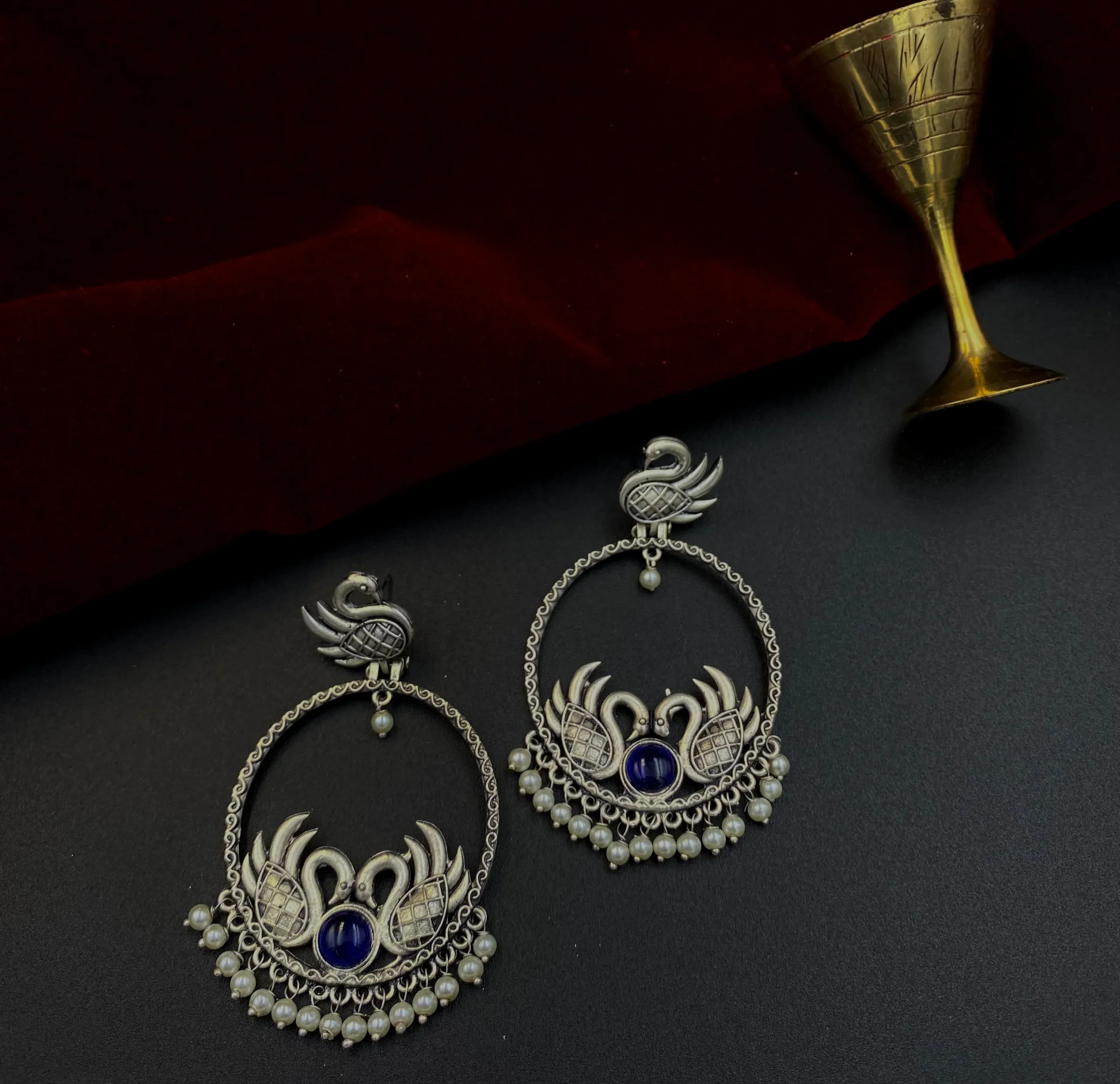 Embrace serene elegance with Rajhans Chakra Indraneel – A Joyful Embrace, a truly captivating pair of oxidised earrings. Meticulously crafted with a distinct antique silver-tone finish, these unique pieces feature a graceful circular hoop design (‘Chakra’ – evoking a wheel or circle of life) from which two intricately detailed royal swan-like motifs (‘Rajhans’ – symbolizing regal grace, purity, and spiritual wisdom) emerge, seemingly embracing at the base. At their heart, a luminous dark blue stone (our ‘Indraneel’ – reminiscent of a deep blue sapphire, a jewel of legends) adds a touch of ethereal beauty. This harmonious blend of symbolic motifs and delicate color creates an aura of tranquil sophistication. Perfect for those who seek a statement piece that speaks volumes of inner peace and artistic balance, Rajhans Chakra effortlessly enhances any ensemble, bringing a unique blend of tradition and calming charm.