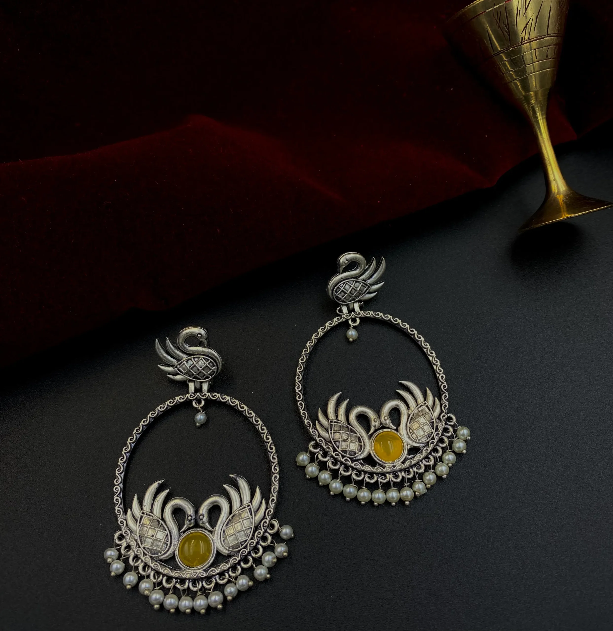 Embrace serene elegance with Rajhans Chakra Kanaka – A Joyful Embrace, a truly captivating pair of oxidised earrings. Meticulously crafted with a distinct antique silver-tone finish, these unique pieces feature a graceful circular hoop design (‘Chakra’ – evoking a wheel or circle of life) from which two intricately detailed royal swan-like motifs (‘Rajhans’ – symbolizing regal grace, purity, and spiritual wisdom) emerge, seemingly embracing at the base. At their heart, a luminous yellow stone (our ‘Kanaka’ – evoking the brilliant glow of gold or sacred prosperity) adds a touch of ethereal beauty. This harmonious blend of symbolic motifs and delicate color creates an aura of tranquil sophistication. Perfect for those who seek a statement piece that speaks volumes of inner peace and artistic balance, Rajhans Chakra effortlessly enhances any ensemble, bringing a unique blend of tradition and calming charm.