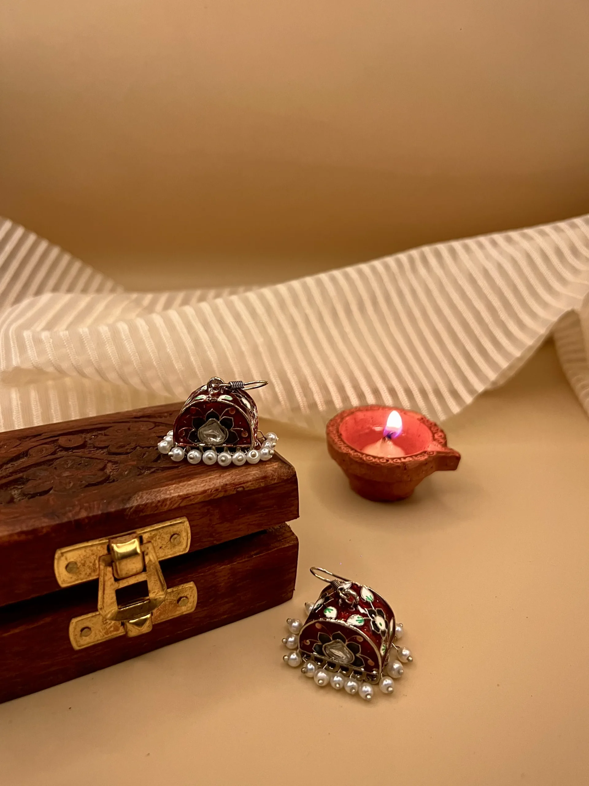 Behold Sindoori Chakori, an enchanting pair of Meenakari jhumkas that are a testament to exquisite craftsmanship. These earrings feature a unique, rounded, and elegant pot-like shape, adorned with a vibrant dark red enamel base and delicate floral motifs. The cluster of delicate pearls hanging from the base adds a touch of playful charm. Whether you’re dressing up a simple kurti for a day out, adding a pop of color to your short kurti ensemble, or completing your look for a traditional suit or saree, these jhumkas are designed to complement any outfit, making them perfect for every occasion.
