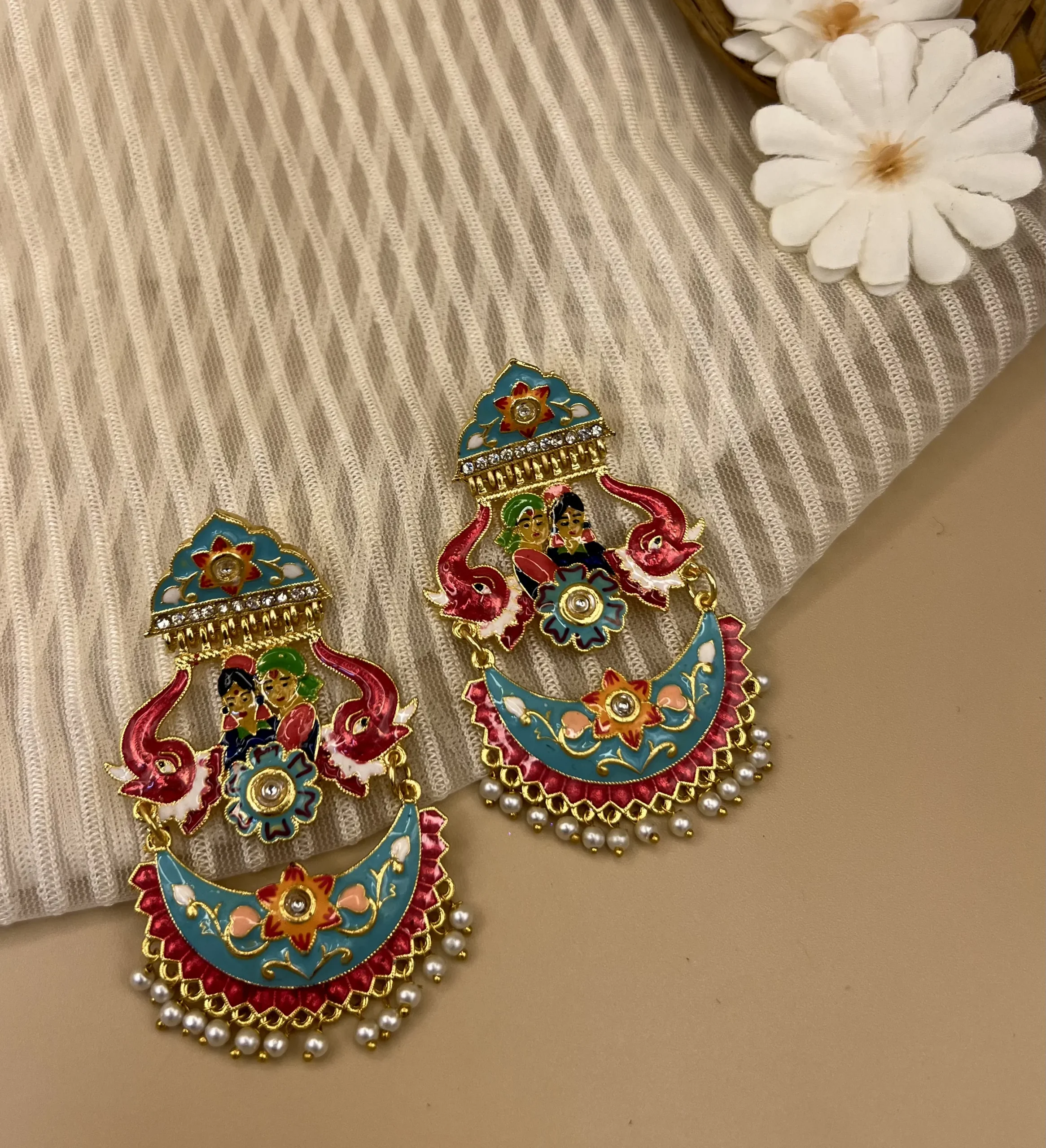 Drape yourself in divine romance with our Swayamvar Firozi earrings, a regal ode to tradition. These exquisite handcrafted chandeliers feature an enameled Yugal (couple) motif in vibrant hues. The Mehendi polished design blends intricate detailing with temple art finesse. Accented with delicate pearl drops and sparkling stones, they are perfect for traditional bliss or festive flair.