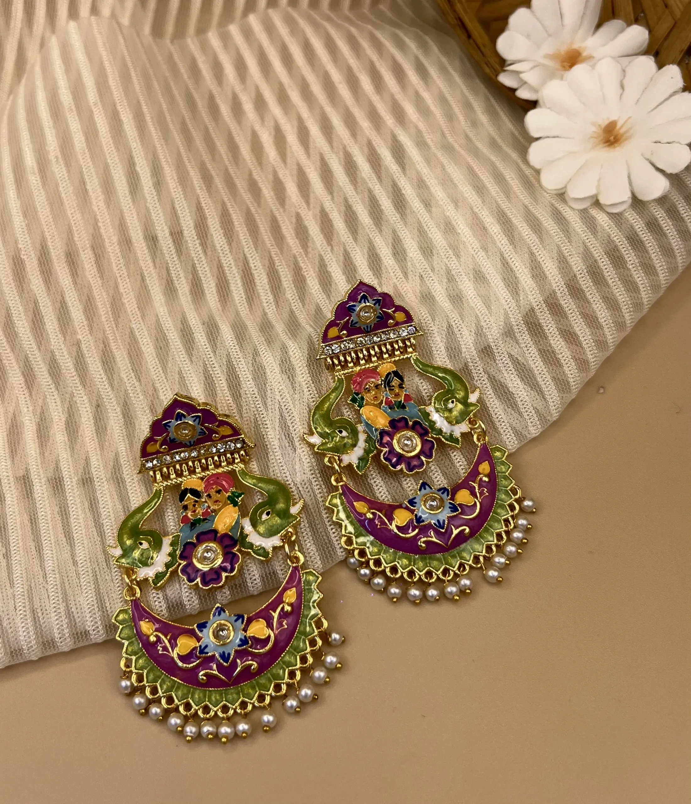 Drape yourself in divine romance with our Swayamvar Harit earrings, a regal ode to tradition. These exquisite handcrafted chandeliers feature an enameled Yugal (couple) motif in vibrant hues. The Mehendi polished design blends intricate detailing with temple art finesse. Accented with delicate pearl drops and sparkling stones, they are perfect for traditional bliss or festive flair.