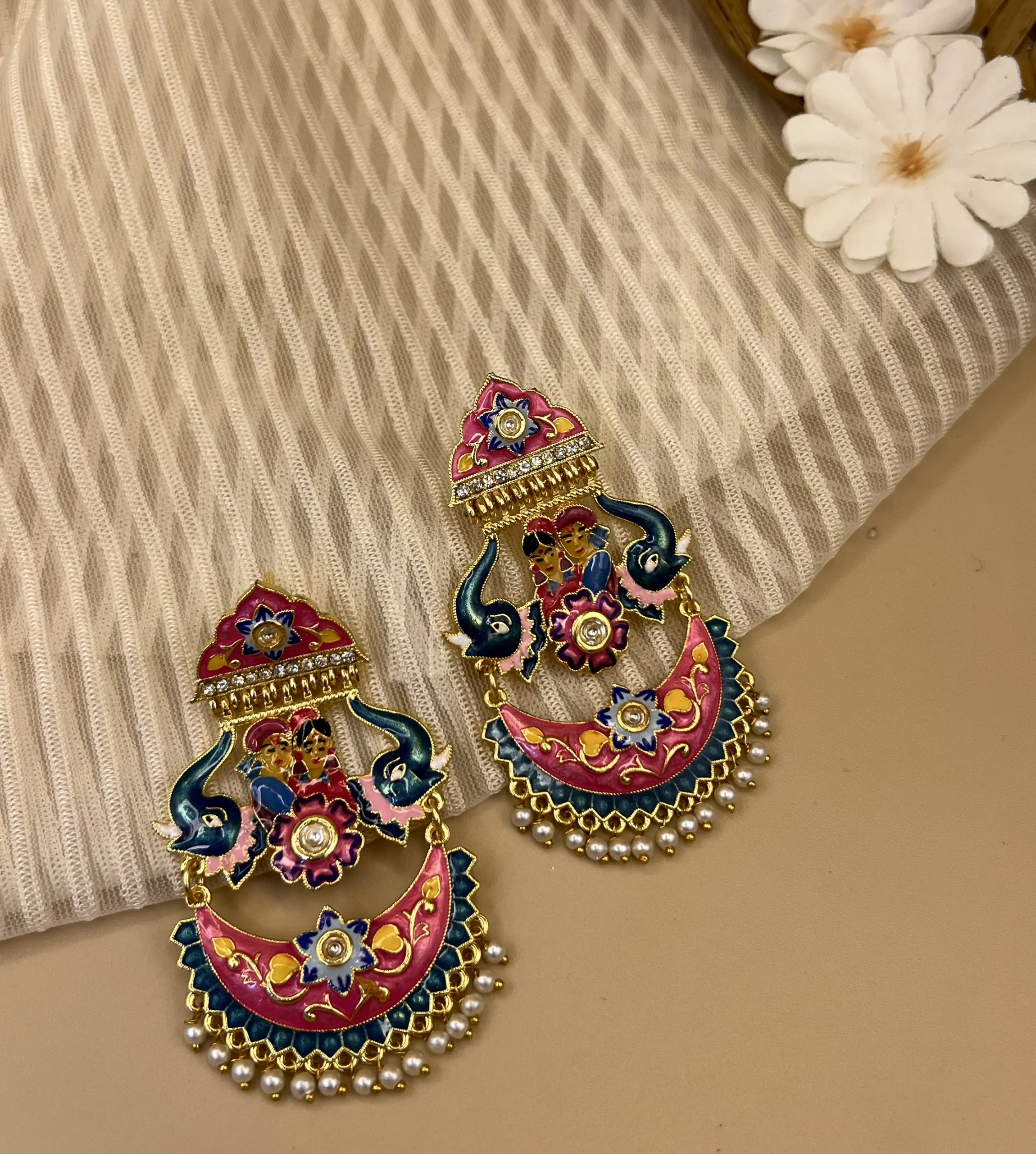 Drape yourself in divine romance with our Swayamvar Neelambari earrings, a regal ode to tradition. These exquisite handcrafted chandeliers feature an enameled Yugal (couple) motif in vibrant hues. The Mehendi polished design blends intricate detailing with temple art finesse. Accented with delicate pearl drops and sparkling stones, they are perfect for traditional bliss or festive flair.