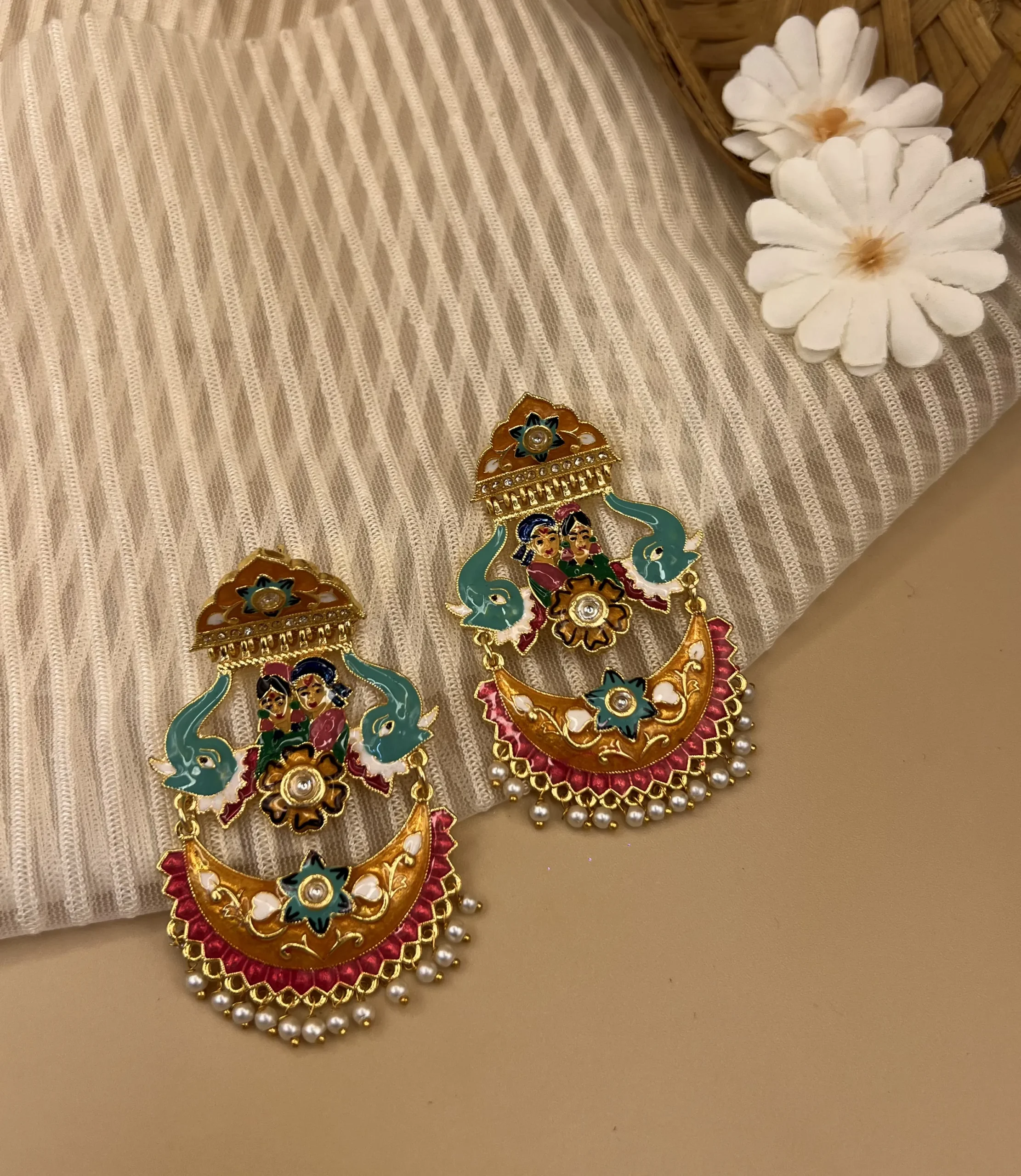 Drape yourself in divine romance with our Swayamvar Rangrez earrings, a regal ode to tradition. These exquisite handcrafted chandeliers feature an enameled Yugal (couple) motif in vibrant hues. The Mehendi polished design blends intricate detailing with temple art finesse. Accented with delicate pearl drops and sparkling stones, they are perfect for traditional bliss or festive flair.
