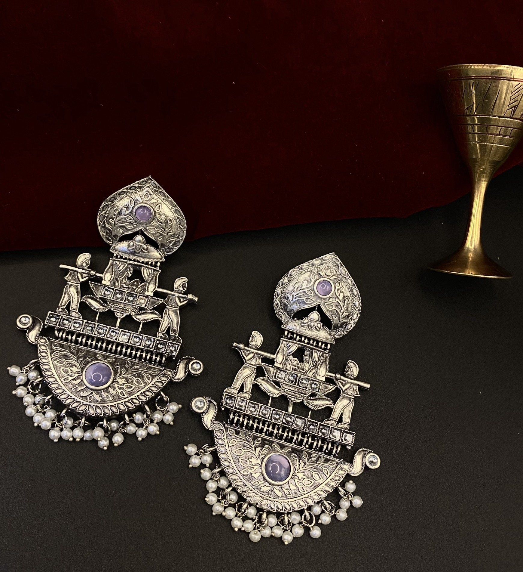 Step into a grand narrative with Vahini Bhairavi – A Royal Procession, a truly exceptional and one-of-a-kind pair of oxidised earrings. Meticulously crafted with a distinct antique silver-tone finish, these exquisite pieces feature an intricate design reminiscent of a royal palanquin or carriage, gracefully ‘carried’ by finely detailed figures. The name ‘Vahini’ (वाहिनी) beautifully captures this essence, meaning ‘carrier’ or ‘bearer’, and also evoking the imagery of a flow or journey. Adorned with luminous light purple/lavender stones (our ‘Bhairavi’ – referencing a profound classical raga, evoking deep and spiritual tones), these earrings evoke the splendor of a majestic event. A cascade of luminous white pearls gracefully sways beneath, adding to the majestic allure and movement. Perfect for those who seek to wear a distinct piece of art that tells a story, Vahini Bhairavi effortlessly elevates any ensemble, from traditional celebrations to adding a touch of historical grandeur to modern wear, ensuring a statement of grace and sophistication.