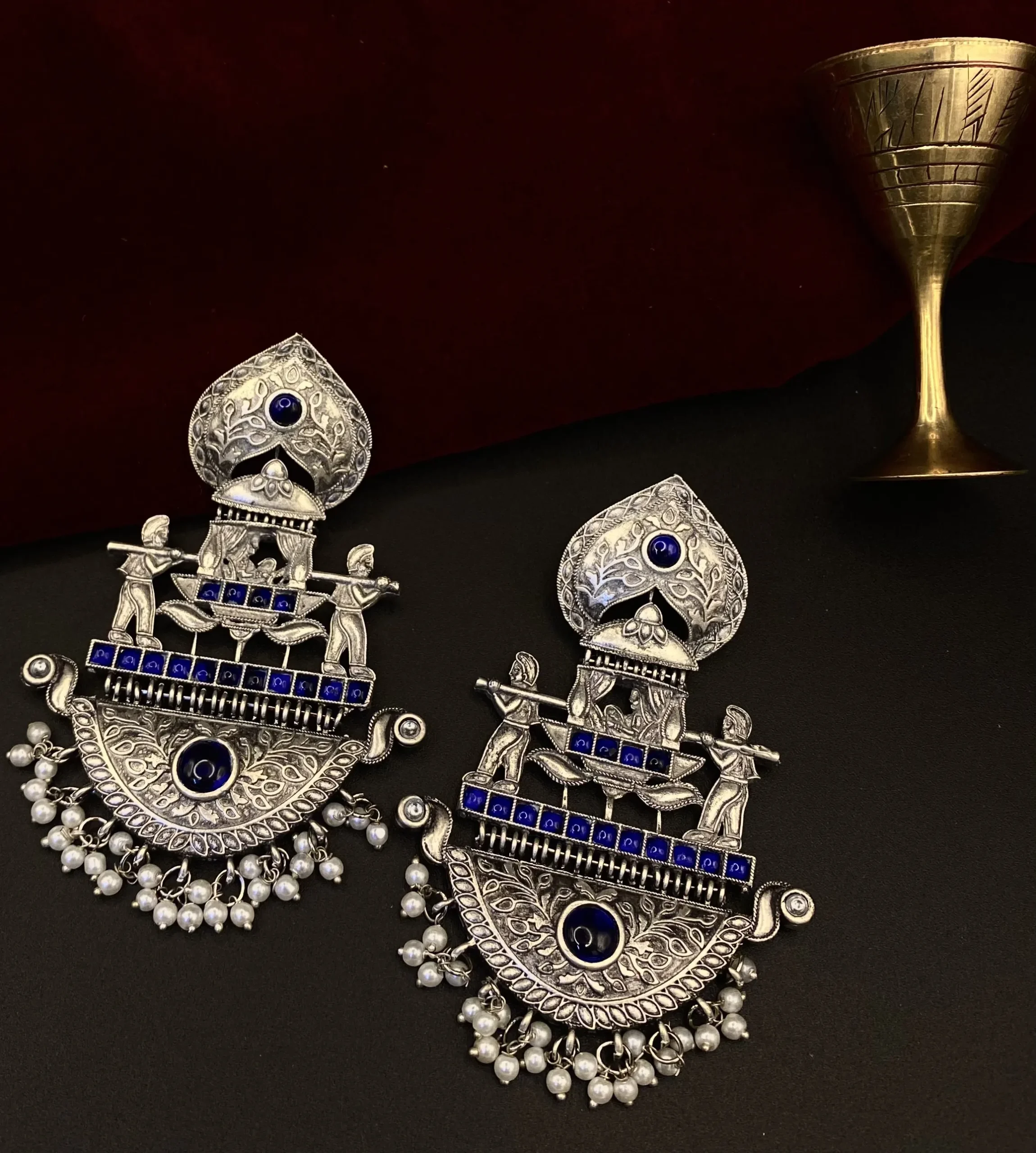 Step into a grand narrative with Vahini Shyam Rang – A Royal Procession, a truly exceptional and one-of-a-kind pair of oxidised earrings. Meticulously crafted with a distinct antique silver-tone finish, these exquisite pieces feature an intricate design reminiscent of a royal palanquin or carriage, gracefully ‘carried’ by finely detailed figures. The name ‘Vahini’ (वाहिनी) beautifully captures this essence, meaning ‘carrier’ or ‘bearer’, and also evoking the imagery of a flow or journey. Adorned with luminous dark blue stones (our ‘Shyam Rang’ – a hue symbolizing divine beauty, depth, and serenity, deeply associated with auspicious festivals and devotional celebrations), these earrings evoke the splendor of a majestic event. A cascade of luminous white pearls gracefully sways beneath, adding to the majestic allure and movement. Perfect for those who seek to wear a distinct piece of art that tells a story, Vahini Shyam Rang effortlessly elevates any ensemble, from traditional celebrations to adding a touch of historical grandeur to modern wear, ensuring a statement of grace and sophistication.